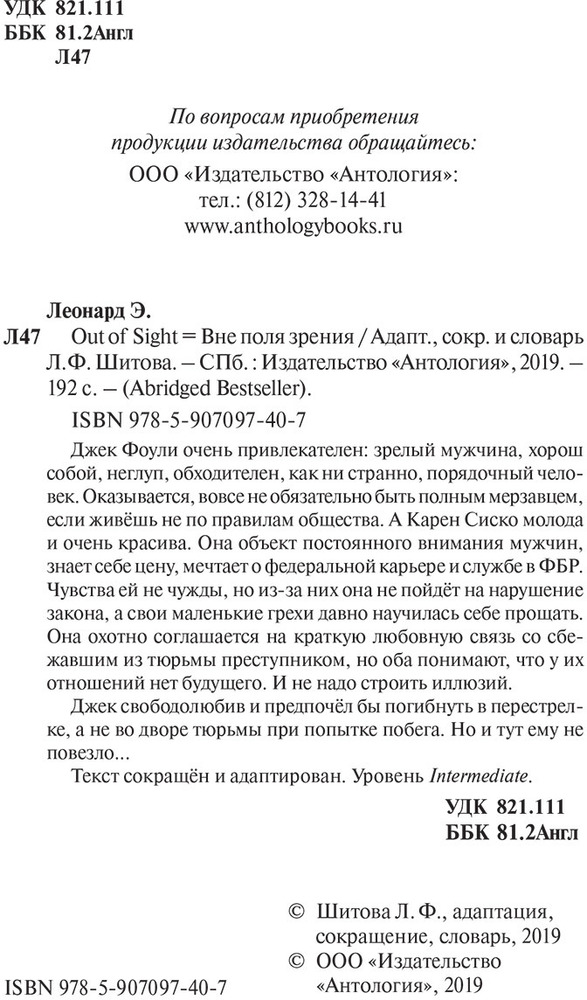 В данный момент этот товар отсутствует в продаже. Возможно, у нас найдется аналогичный или похожий товар здесь. Серия: Abridged Bestseller Джек Фоули очень привлекателен: зрелый мужчина, хорош собой, неглуп, обходителен, как ни странно, порядочный человек. Оказывается, вовсе не обязательно быть полным мерзавцем, если живёшь не по правилам общества. А Карен Сиско молода и очень красива. Она объект постоянного внимания мужчин, знает себе цену, мечтает о федеральной карьере и службе в ФБР. Чувства ей не чужды, но из-за них она не пойдёт на нарушение закона, а свои маленькие грехи давно научилась себе прощать. Она охотно соглашается на краткую любовную связь со сбежавшим из тюрьмы преступником, но оба понимают, что у их отношений нет будущего. И не надо строить иллюзий. Джек свободолюбив и предпочёл бы погибнуть в перестрелке, а не во дворе тюрьмы при попытке побега. Но и тут ему не повезло.