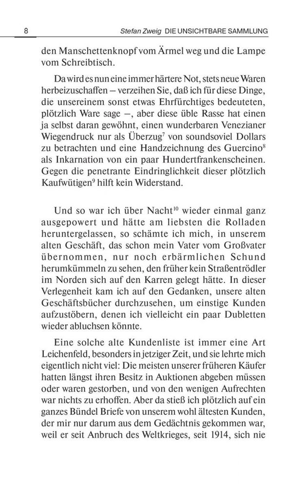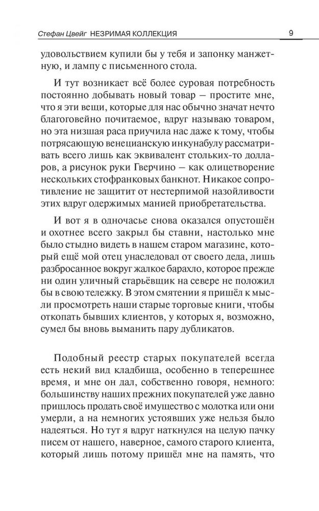 В центре сюжетов представленных в книге произведений — драма человека, живущего в своём собственном мире, одержимого пламенной страстью. Столкновение с реальностью, которую в обеих новеллах воплощает Первая мировая война, разрушает хрупкую, иллюзорную жизнь героев. Близкие пытаются их спасти, но зачастую лишь губят их, как в «Незримой коллекции». Либо герой сам не в состоянии ничего противопоставить неумолимым жерновам истории, от которых он не только не пытается защититься, но даже и не подозревает об их существовании («Мендель-букинист»).