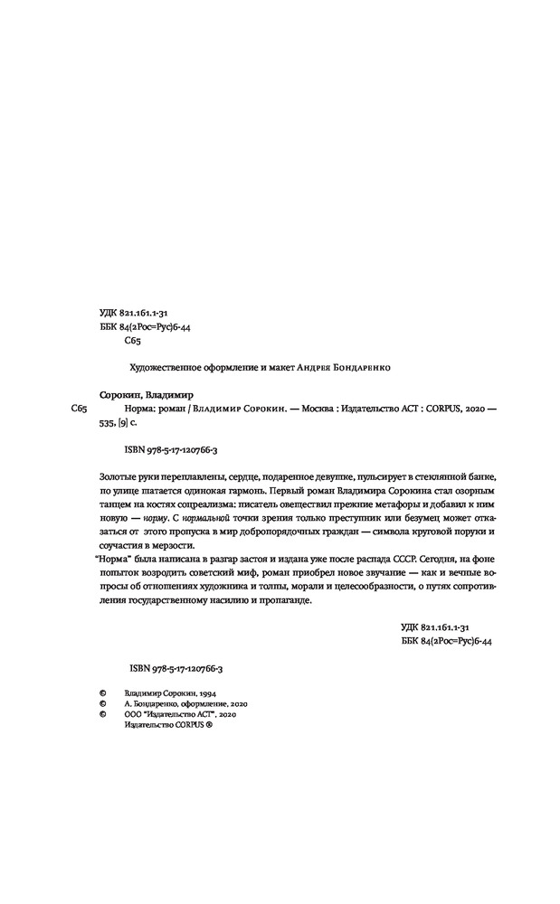 НормаВ данный момент этот товар отсутствует в продаже. Возможно, у нас найдется аналогичный или похожий товар здесь. Серия: Весь Сорокин Золотые руки переплавлены, сердце, подаренное девушке, пульсирует в стеклянной банке, по улице шатается одинокая гармонь. Первый роман Владимира Сорокина стал озорным танцем на костях соцреализма: писатель овеществил прежние метафоры и добавил к ним новую — норму. С нормальной точки зрения только преступник или безумец может отказаться от этого пропуска в мир добропорядочных граждан — символа круговой поруки и соучастия в мерзости. «Норма» была написана в разгар застоя и издана уже после распада СССР. Сегодня, на фоне попыток возродить советский миф, роман приобрел новое звучание — как и вечные вопросы об отношениях художника и толпы, морали. |