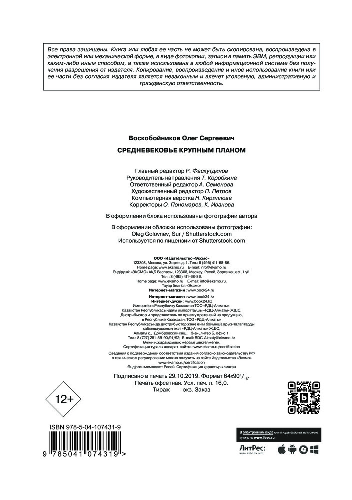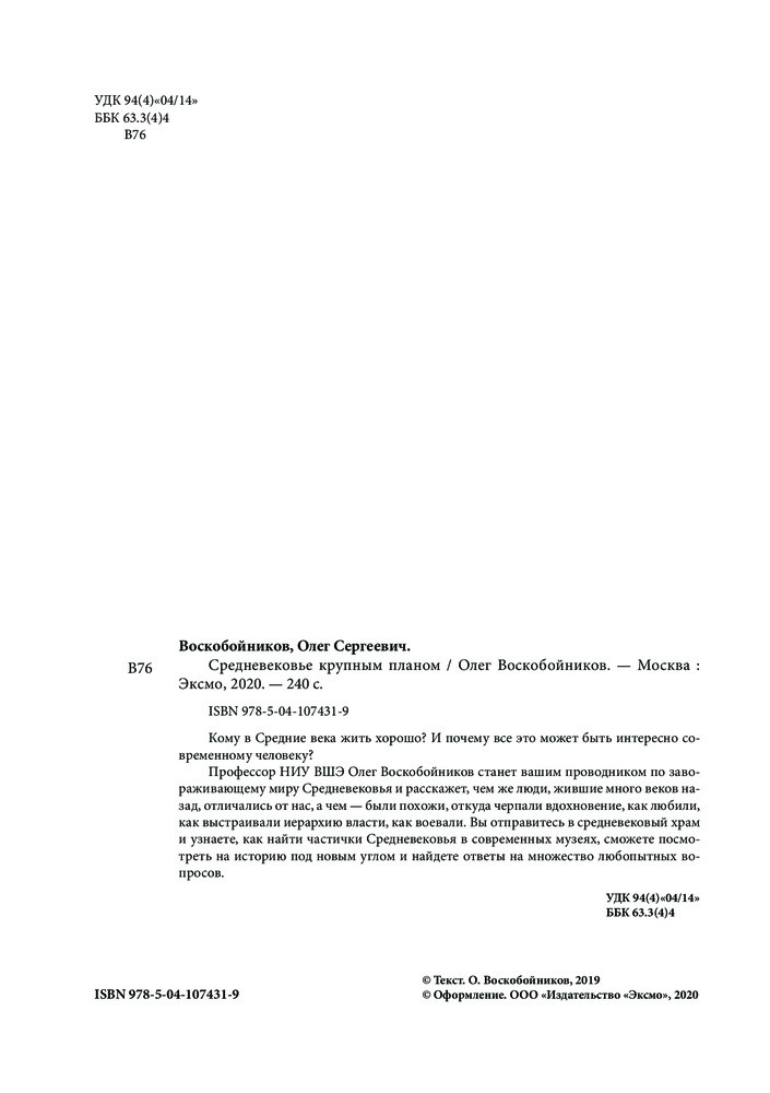 Средневековье крупным планомкрасочные иллюстрации наличие источников поверхностная информация В данный момент этот товар отсутствует в продаже. Возможно, у нас найдется аналогичный или похожий товар здесь. Серия: Путешественники во времени Кому в Средние века жить хорошо? И почему все это может быть интересно современному человеку? Профессор НИУ ВШЭ Олег Воскобойников станет вашим проводником по завораживающему миру Средневековья и расскажет, чем же люди, жившие много веков назад, отличались от нас, а чем — были похожи, откуда черпали вдохновение, как любили, как выстраивали иерархию власти, как воевали и что служило причиной конфликтов, как и почему одни события оказались предпосылками перемен, а другие — ничуть не меняли ход истории. Вы отправитесь в средневековый храм и узнаете, как найти частички Средневековья в современных музеях, сможете посмотреть на историю под новым углом и найдете ответы на множество любопытных вопросов. |