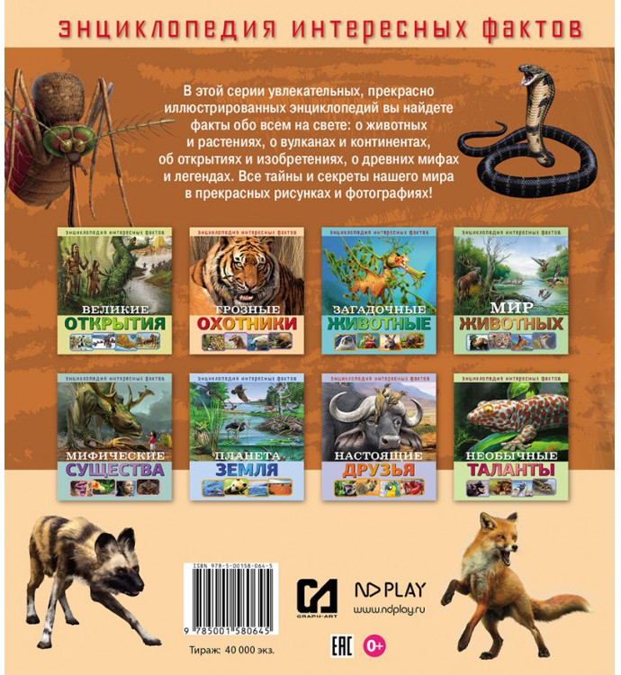 💳 Оплатить за товар можно при получении 🇰🇿 Есть бесплатная доставка по Казахстану от 1 дня 🎁 Копите бонусы с каждой покупки Серия: Энциклопедия интересных фактов В этой серии увлекательных, прекрасно иллюстрированных энциклопедий вы найдете факты обо всем на свете: о животных и растениях, о вулканах и континентах, об открытиях и изобретениях, о древних мифах и легендах. Все тайны и секреты нашего мира в прекрасных рисунках и фотографиях! Познавательные книжки станут незаменимым помощником в развитии и обучении вашего ребёнка. |