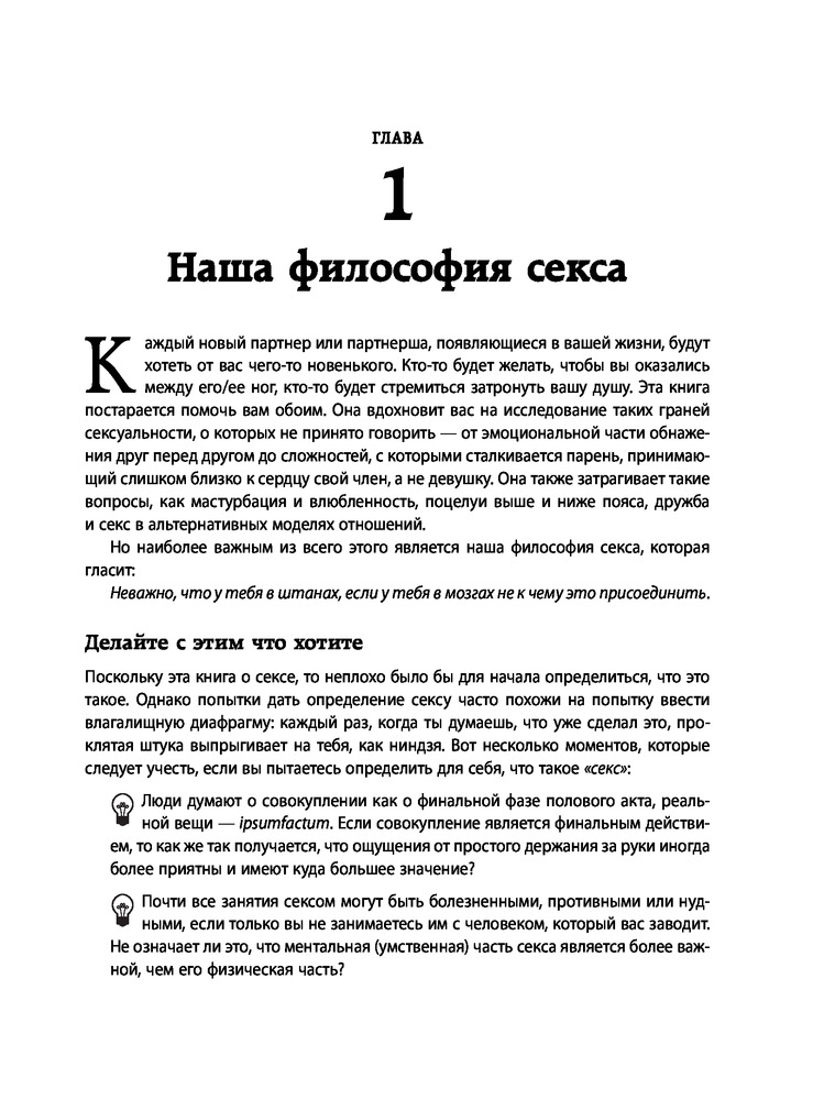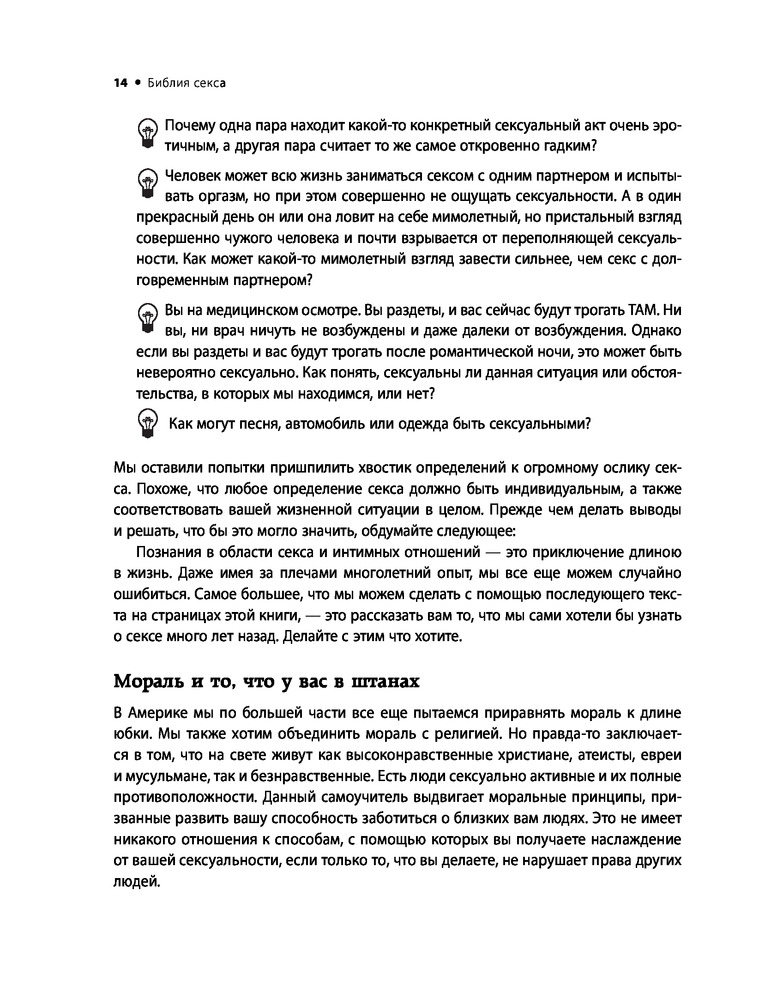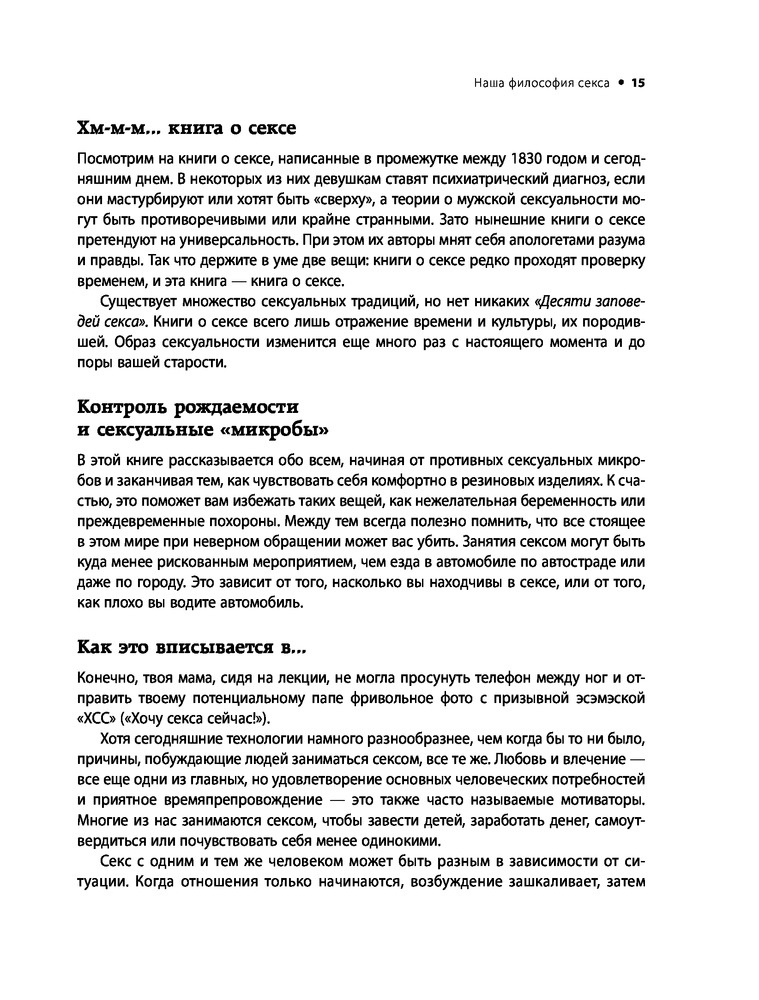 Библия секса. Самые важные правилаВ данный момент этот товар отсутствует в продаже. Возможно, у нас найдется аналогичный или похожий товар здесь. Серия: Камасутра XXI века для продвинутых Кое-что изменилось с тех пор, как первая версия «Библии секса» ушла в печать. Но мы все так же хотим, чтобы секс был чем-то особенным, а ответы на наши вопросы о нем — проще. Итак, легендарная «Библия» возвращается! Только теперь в ней собраны все самые важные правила, которые станут вашими верными спутниками на пути к сексуальному наслаждению. В сокращенной версии есть и совершенно новые главы. Спорим, об этом вы еще не читали. Сексопатологи называют «Библию» одной из лучших книг о сексе. Если вам нравится заниматься им, вы интересуетесь им или нервничаете из-за него — доверьтесь, это книга для вас. |