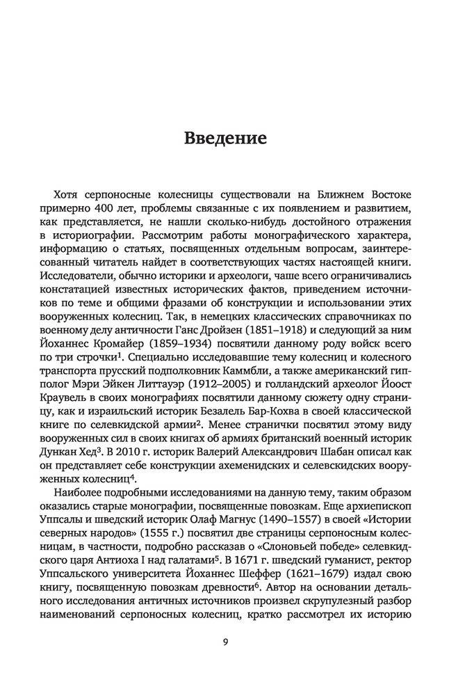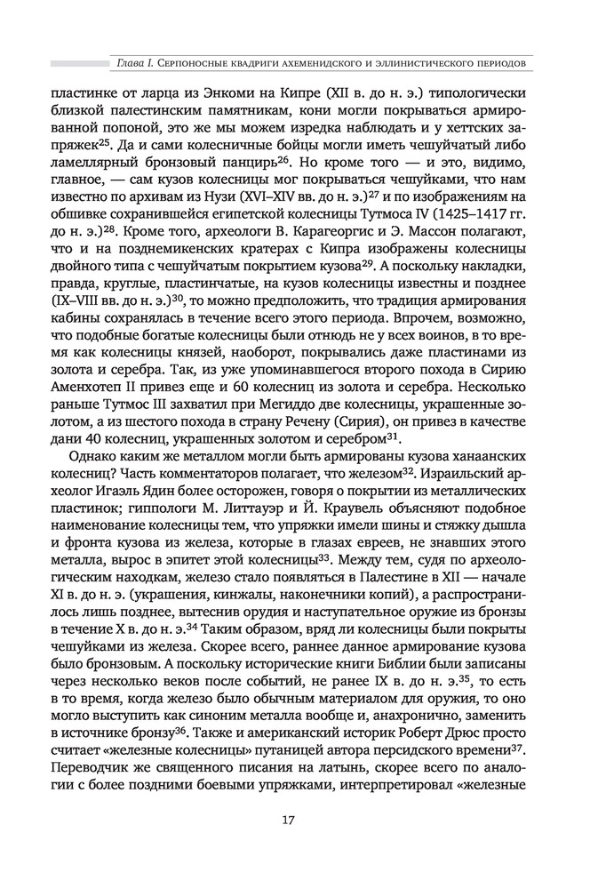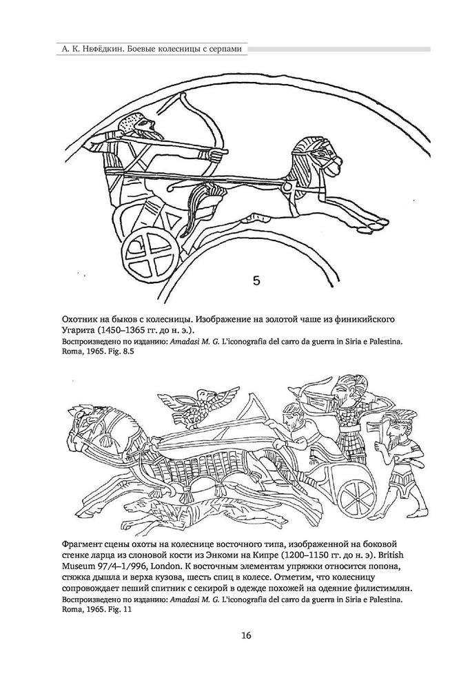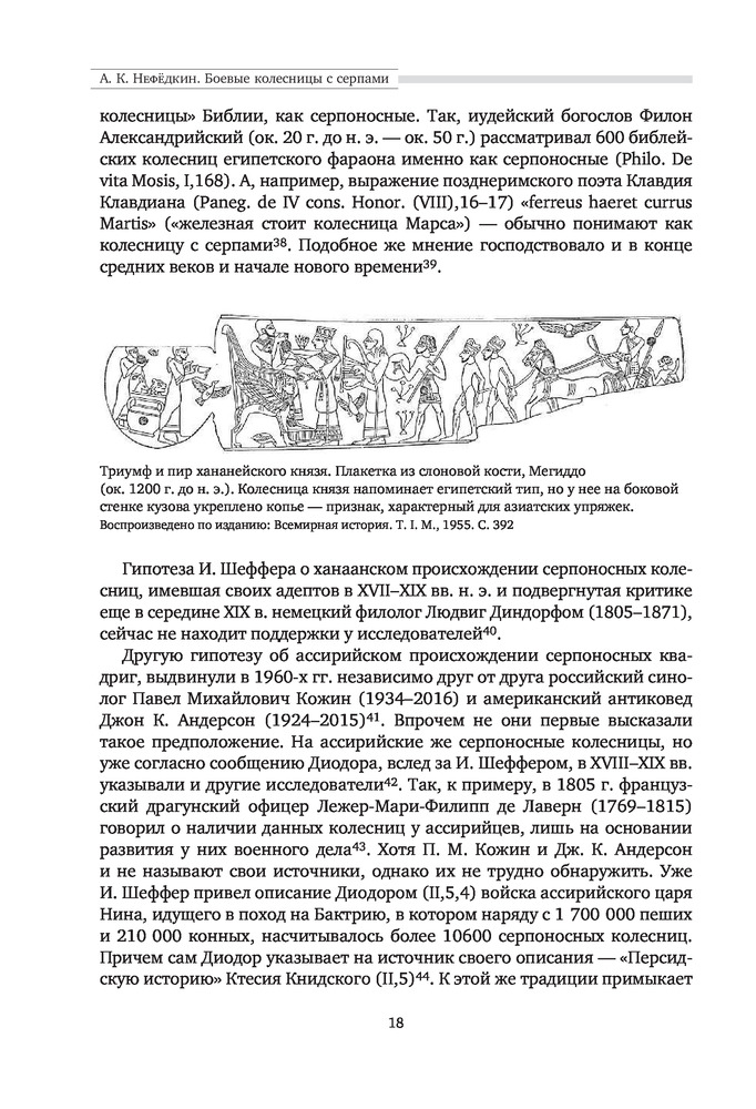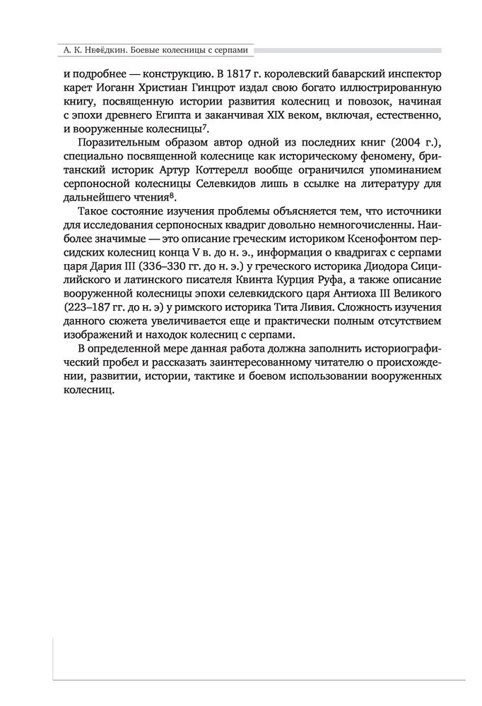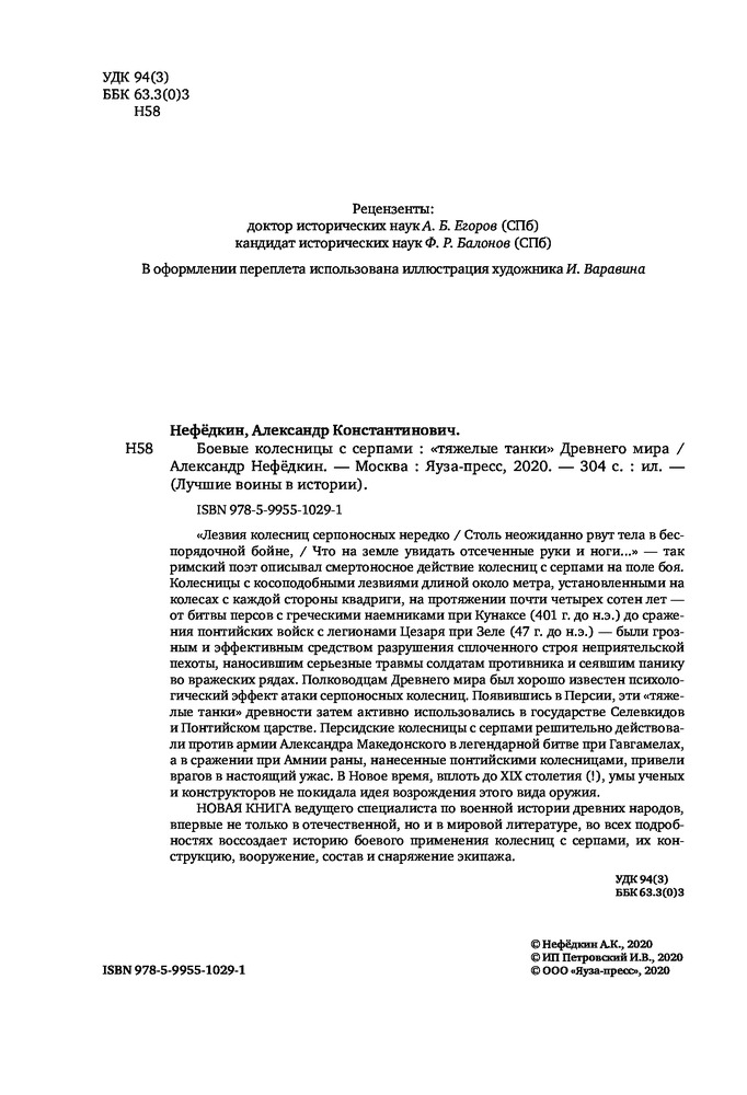 "Боевые колесницы с серпами. «Тяжелые танки» Древнего мира" - весьма достойная работа российского историка, переводчика античных военных трактатов, доктора исторических наук, ведущего научного сотрудника научно-исследовательской Лаборатории исторической антропологии Белгородского государственного национального исследовательского университета, специалиста в области военного дела греков, македонян, персов, сарматов, готов, чукчей и тунгусов; а также отдельных родов войск (мегаристов, элефантерии, конницы и тяжёлой пехоты) - Нефёдкина Александра Константиновича. Как отмечает в предисловии к книге сам автор, что "настоящее издание представляет собой издание глав IV-V монографии 2001 года, которые подверглись определенной переработке". Тем не менее, данную работу, можно рассматривать как самостоятельное научное исследование по теме серпоносных колесниц и их роли в истории. Книга строго научна, но интересна и познавательна. Читается легко. Как пишет автор: "Хотя серпоносные колесницы существовали на Ближнем Востоке примерно 400 лет, проблемы связанные с их появлением и развитием, как представляется, не нашли сколько-нибудь достойного отражения в историографии. Исследователи, обычно историки и археологи, чаще всего ограничивались констатацией известных исторических фактов, приведением источников по теме и общими фразами об конструкции и использовании этих колесниц. Такое состояние изучения проблемы объясняется тем, что источники для исследования серпоносных квадриг довольно не многочисленны. Наиболее значимые - это описание греческим историком Ксенофонтом персидских колесниц конца V в.до н.э., информация о квадригах с серпами царя Дария III у греческого историка Диодора Сицилийского и латинского писателя Квинта Курция Руфа, а также описание вооруженной колесницы эпохи селевкидского царя Антиоха III Великого у римского историка Тита Ливия. Сложность изучения данного сюжета увеличивается еще и практически полным отсутствием изображения и находок колесниц с серпами. В определенной мере данная работа должна заполнить историографический пробел и рассказать заинтересованному читателю о происхождении, развитии, истории, тактике и боевом использовании вооруженных колесниц". Удалось это автору или нет - судить читателю. Читайте, делайте свои выводы. Качество издания хорошее.