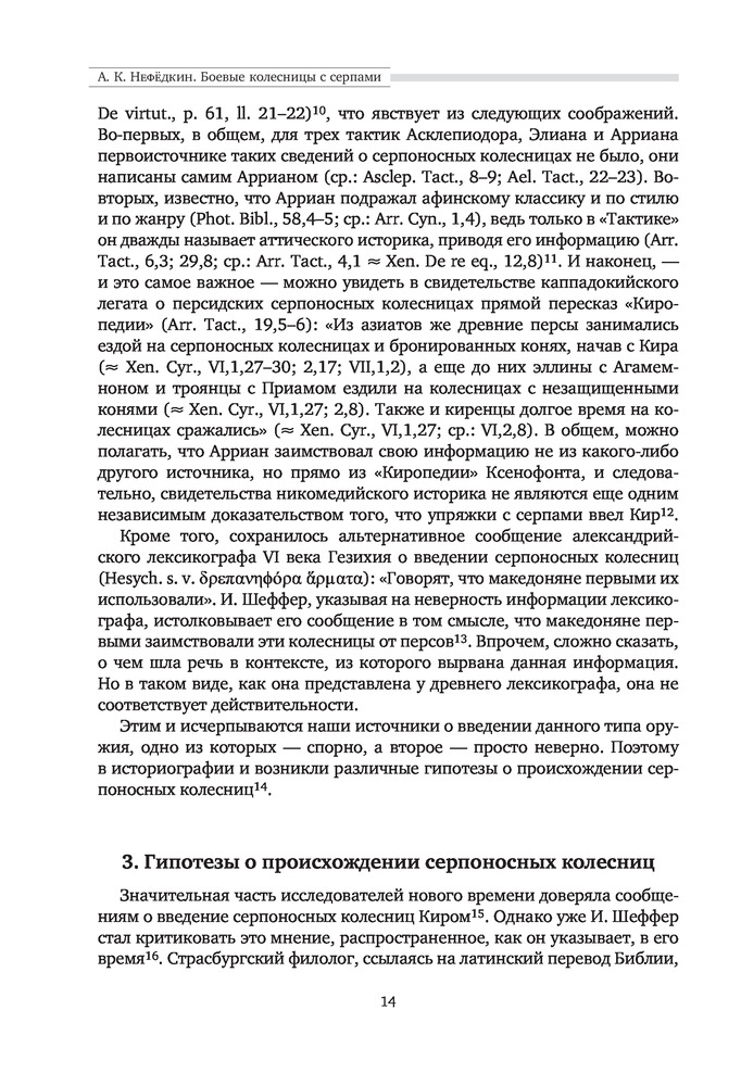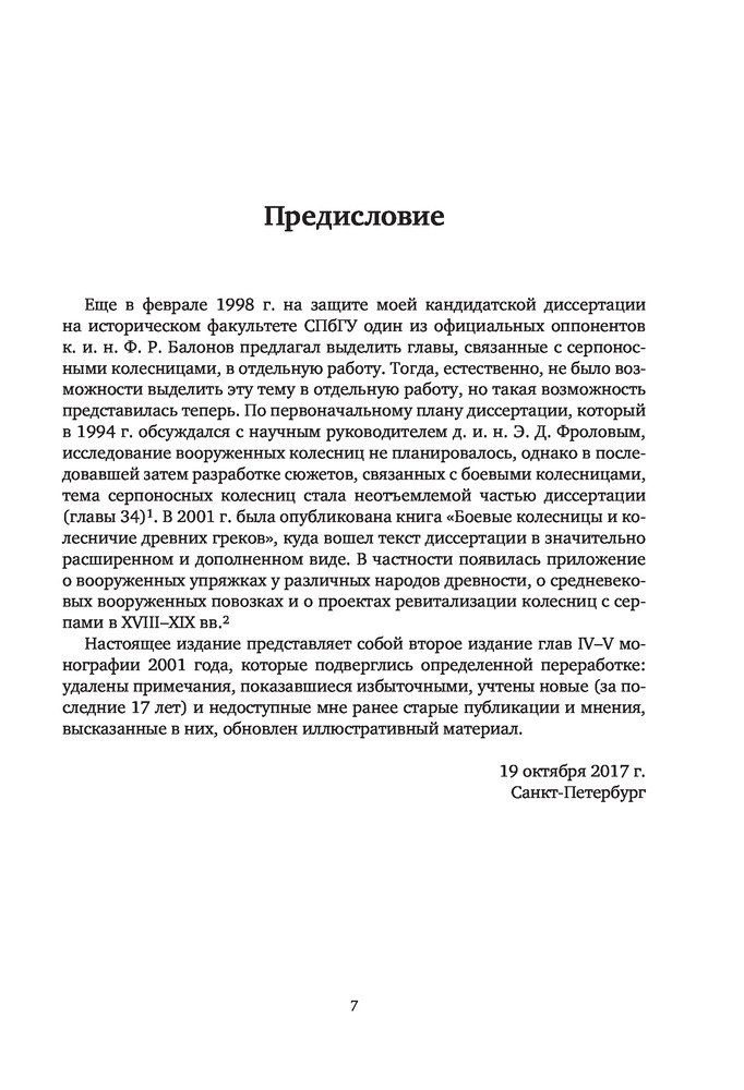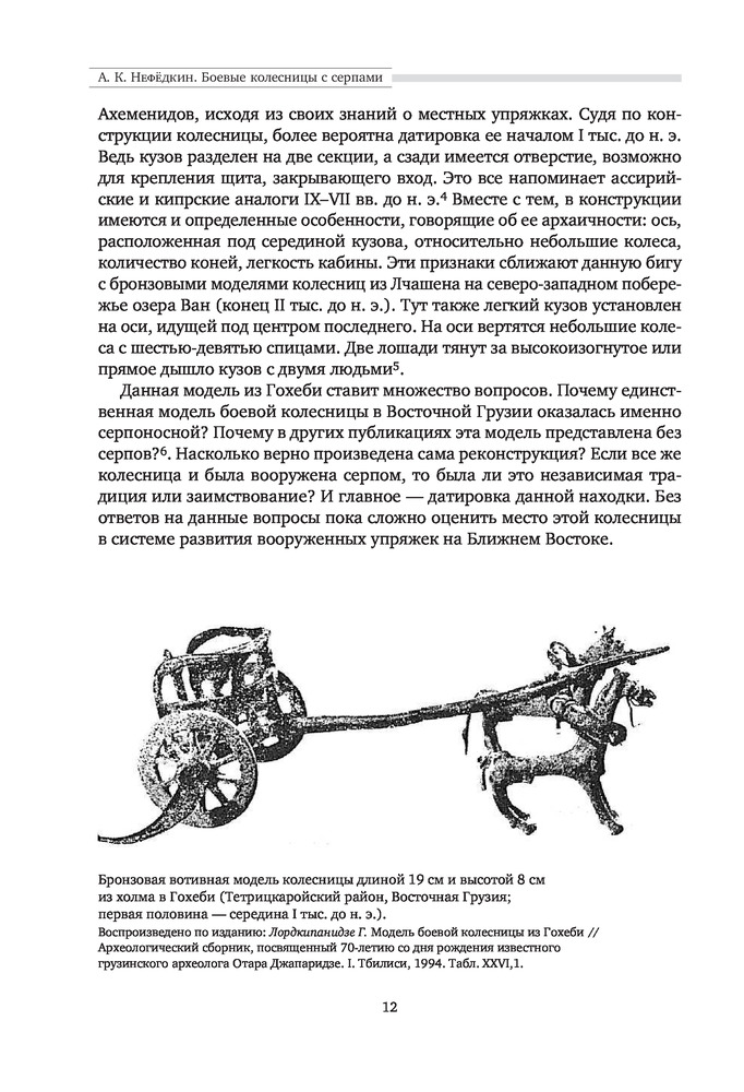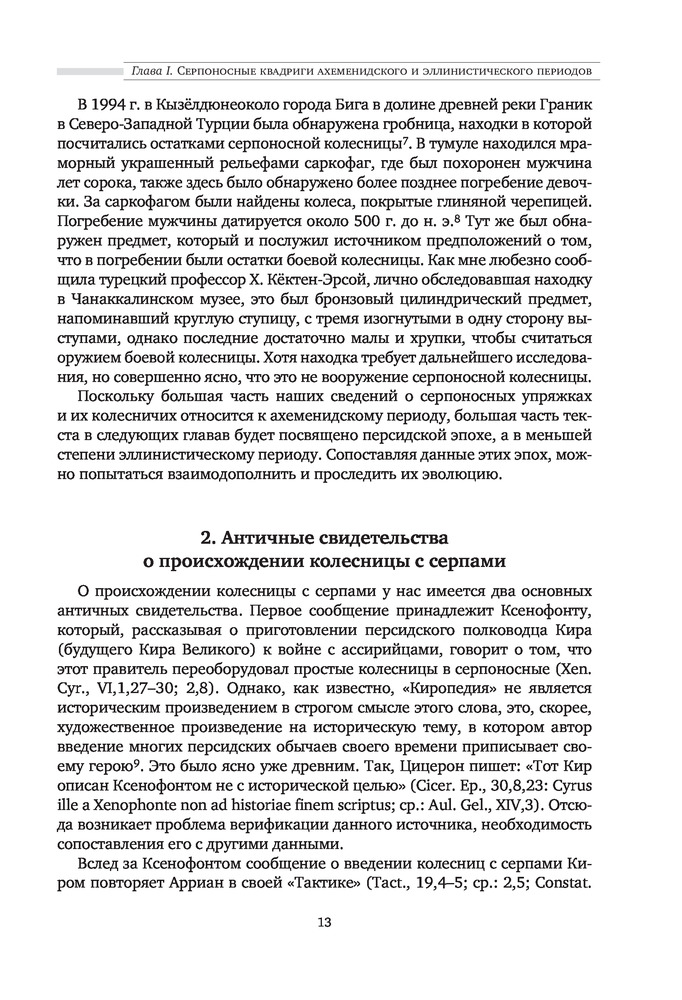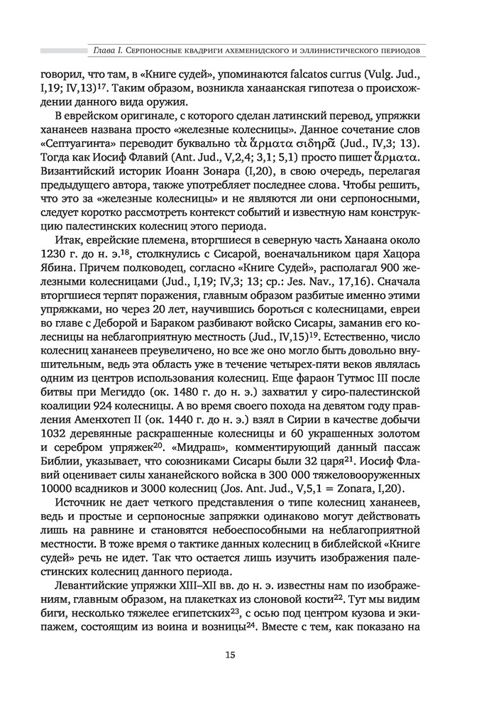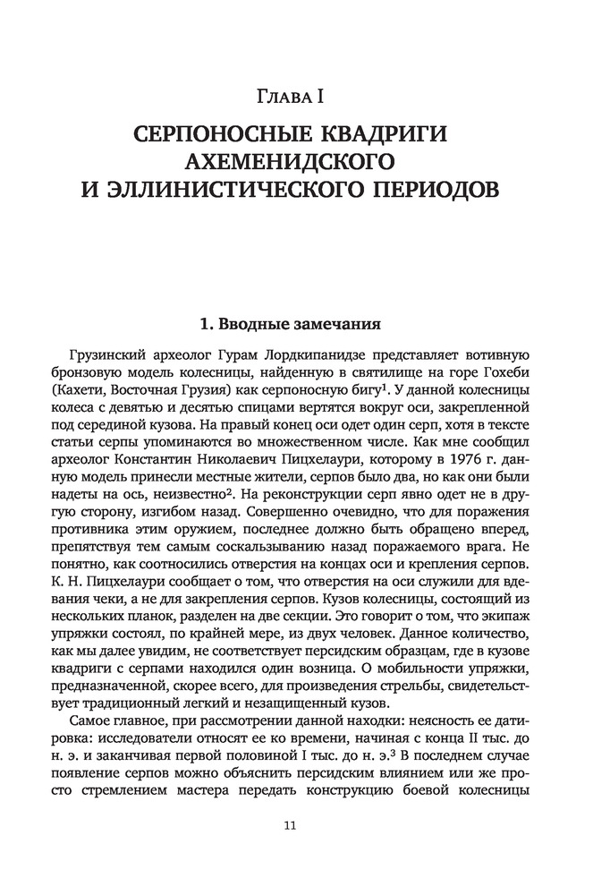 "Боевые колесницы с серпами. «Тяжелые танки» Древнего мира" - весьма достойная работа российского историка, переводчика античных военных трактатов, доктора исторических наук, ведущего научного сотрудника научно-исследовательской Лаборатории исторической антропологии Белгородского государственного национального исследовательского университета, специалиста в области военного дела греков, македонян, персов, сарматов, готов, чукчей и тунгусов; а также отдельных родов войск (мегаристов, элефантерии, конницы и тяжёлой пехоты) - Нефёдкина Александра Константиновича. Как отмечает в предисловии к книге сам автор, что "настоящее издание представляет собой издание глав IV-V монографии 2001 года, которые подверглись определенной переработке". Тем не менее, данную работу, можно рассматривать как самостоятельное научное исследование по теме серпоносных колесниц и их роли в истории. Книга строго научна, но интересна и познавательна. Читается легко. Как пишет автор: "Хотя серпоносные колесницы существовали на Ближнем Востоке примерно 400 лет, проблемы связанные с их появлением и развитием, как представляется, не нашли сколько-нибудь достойного отражения в историографии. Исследователи, обычно историки и археологи, чаще всего ограничивались констатацией известных исторических фактов, приведением источников по теме и общими фразами об конструкции и использовании этих колесниц. Такое состояние изучения проблемы объясняется тем, что источники для исследования серпоносных квадриг довольно не многочисленны. Наиболее значимые - это описание греческим историком Ксенофонтом персидских колесниц конца V в.до н.э., информация о квадригах с серпами царя Дария III у греческого историка Диодора Сицилийского и латинского писателя Квинта Курция Руфа, а также описание вооруженной колесницы эпохи селевкидского царя Антиоха III Великого у римского историка Тита Ливия. Сложность изучения данного сюжета увеличивается еще и практически полным отсутствием изображения и находок колесниц с серпами. В определенной мере данная работа должна заполнить историографический пробел и рассказать заинтересованному читателю о происхождении, развитии, истории, тактике и боевом использовании вооруженных колесниц". Удалось это автору или нет - судить читателю. Читайте, делайте свои выводы. Качество издания хорошее.