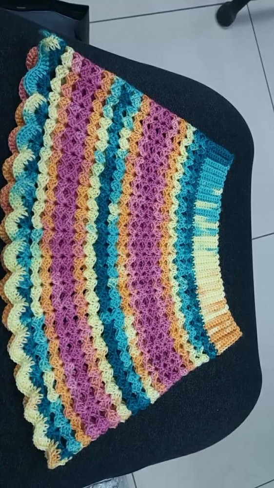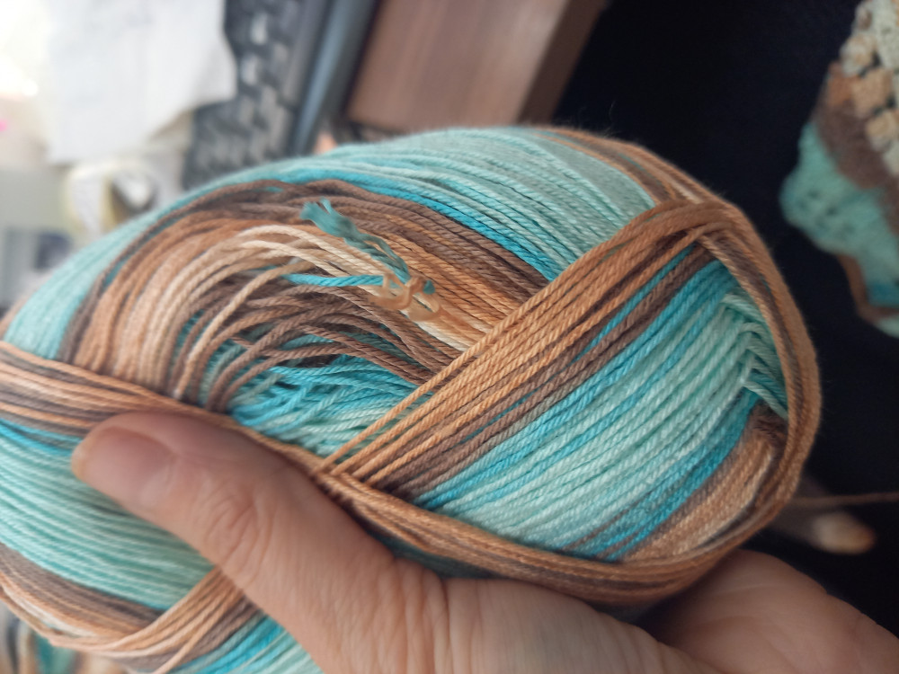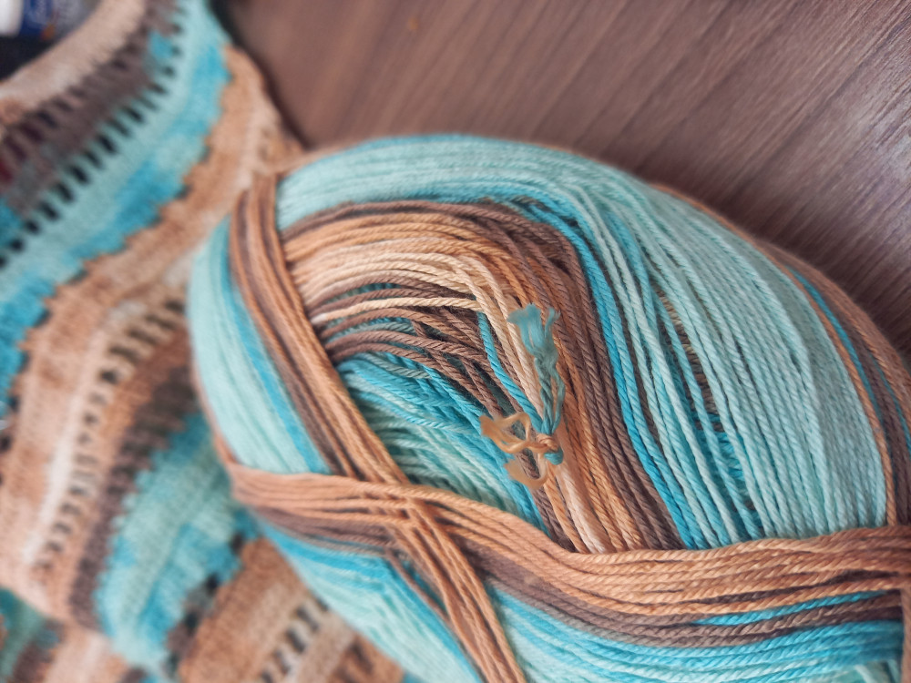 Цвет пряжи очень понравился, вязать легко. Но, в трех клубочках имелись узелки, причем в первых двух цвет хоть совпадал, а в последнем связали бежевую нитку с синей, нарушая плавный переход цвета. Впервые столкнулась с такой проблемой с пряжей, приобретенной в магазине. Очевидна вина производителя, так как узелки были в середине клубков, но все равно приятного мало.