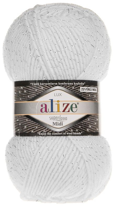 Полушерстяная пряжа «Superlana Midi Lux» классической крутки. Люрексовое волокно в составе делает такую пряжу не только теплой и практичной, но и нарядной. Подойдет для изделий на зиму, весну-осень.