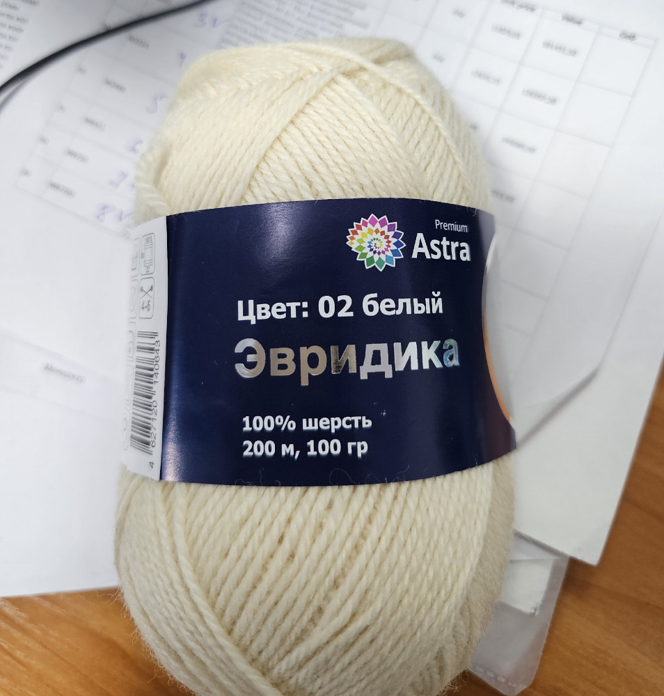 Пряжа не белая, скорее молочная, хотя на этикетке написано именно белая. Нить неравномерная, местами совсем тонкая. Пока не знаю, как будет после ВТО