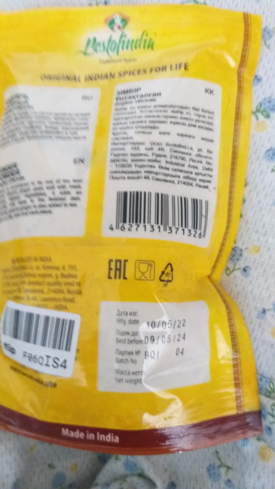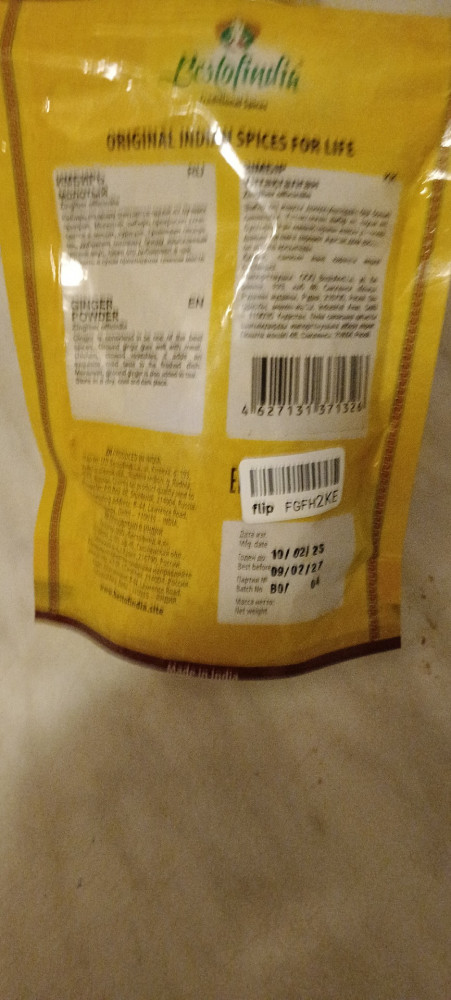 Имбирь хороший ,запах отличный ,вкус остренький , отличный ,советую брать . Индийские приправы отличные еще не разу не разочаровалась Свежие ,срок годности большой ..Отдельное спасибо Флип.
