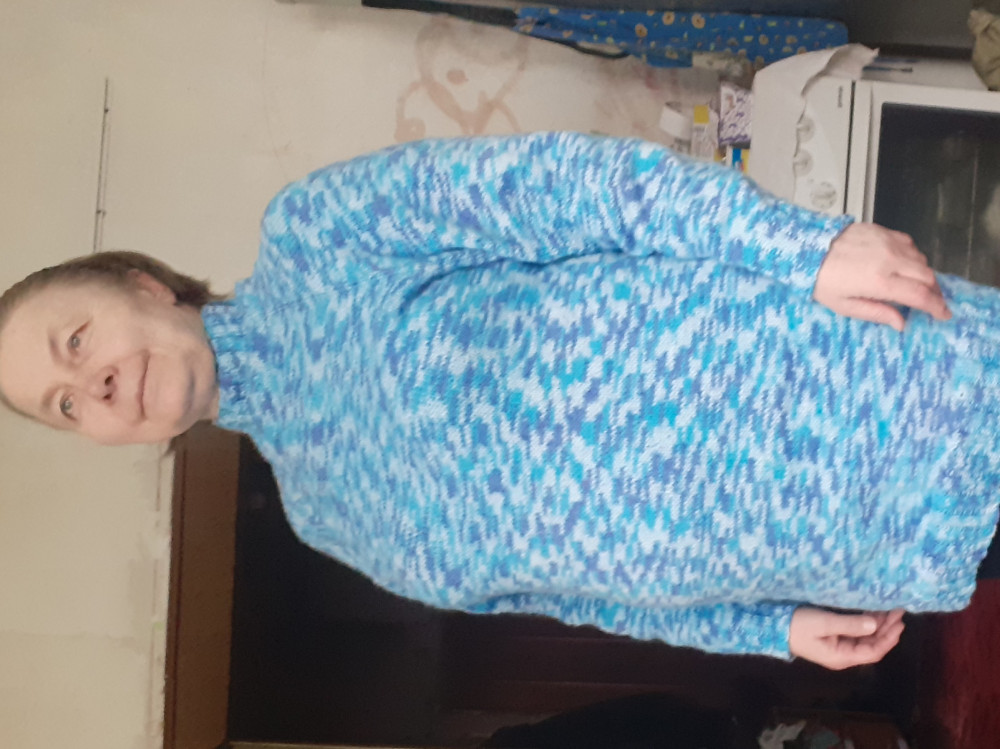 вот такой длинный свитер у меня получился из шести мотков. вяжется быстро, после стирки изделие мягкое