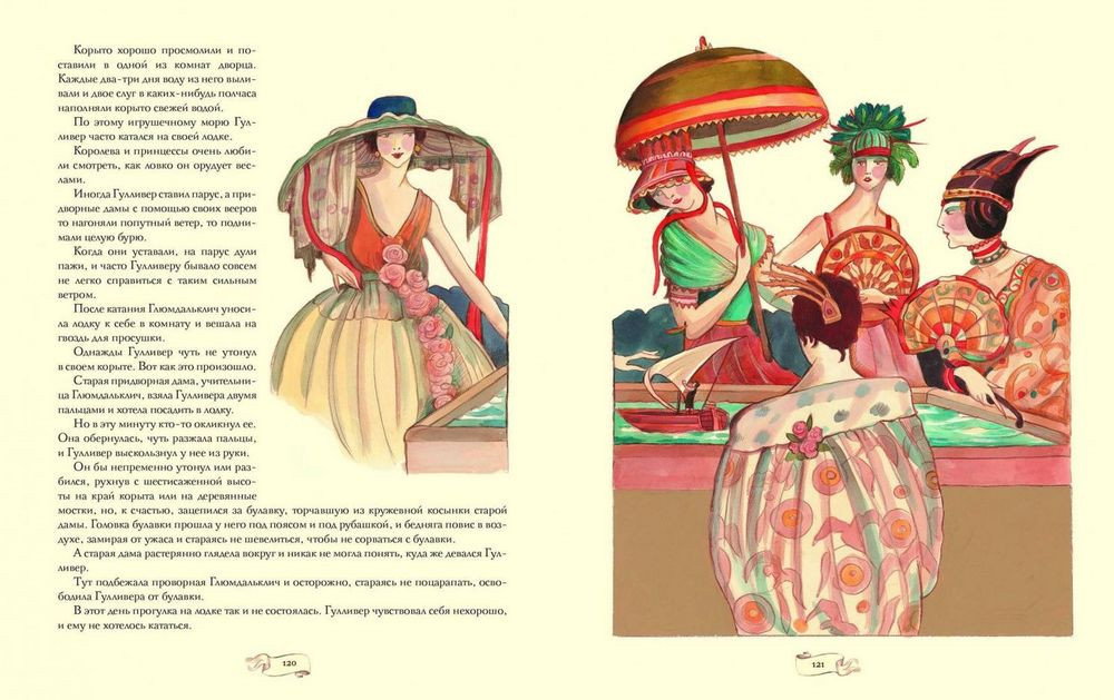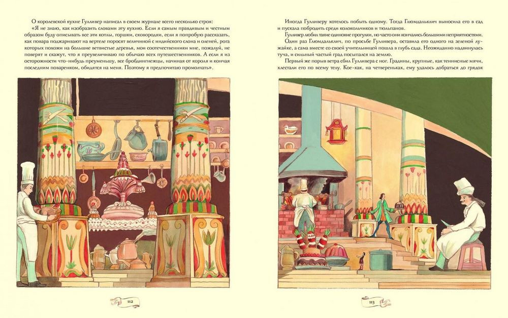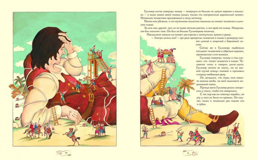 Отличная книга! Большой формат (больше А4), твердый переплет, тканевый корешок, плотная мелованная бумага, качественная печать. Адаптированный для детей пересказ Т.Габбе. В книге два путешествия Гулливера: в страну лилипутов и в страну великанов. Язык повествования увлекательный, доступный для детского восприятия. Книга рассчитана на средний школьный возраст. Иллюстрации Марио Грассо (итальянский художник-иллюстратор) яркие, на каждом развороте.