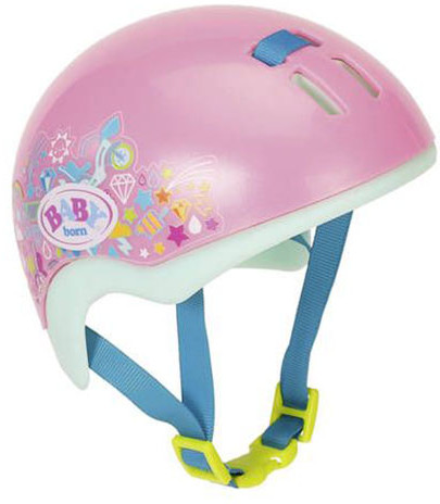 Велосипедный шлем для куколки «Baby born» высотой 43см. Стильный розовый дизайн с принтованным рисунком. Оснащен ремешком-фиксатором, который позволяет шлему плотно облегать голову, и не натирает кожу подбородка.