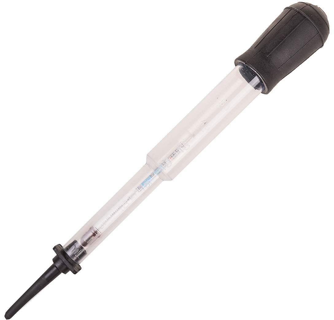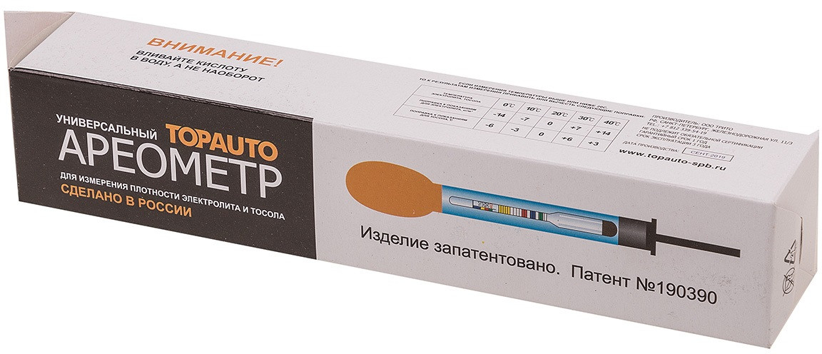 Ареометр для электролита и тосола в бумажной коробке используется для измерения плотности электролита в кислотных и щелочных аккумуляторах, а также для определения температуры замерзания тосола в системе охлаждения двигателя автомобиля.