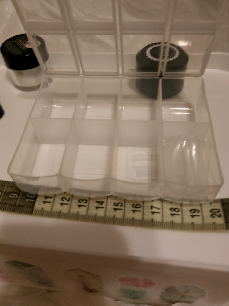 Удобный органайзер для ногтевого дизайна, пластик достаточно крепкий, на крышке для каждой ячейки дополнительные ограничители, исключающие перемешивание содержания ячеек.👍 Удивила наклейка с данными, что это органайзер для пищевых продуктов. 🤔