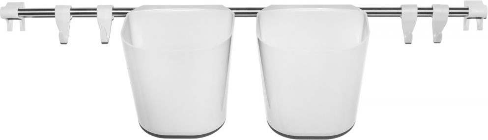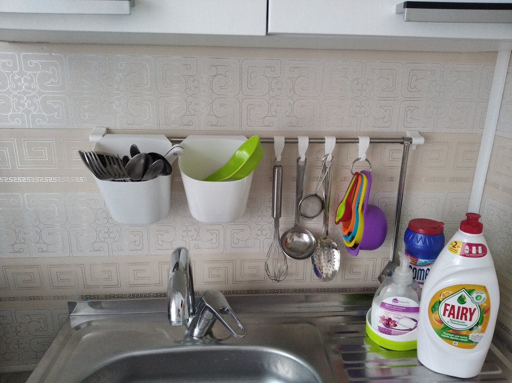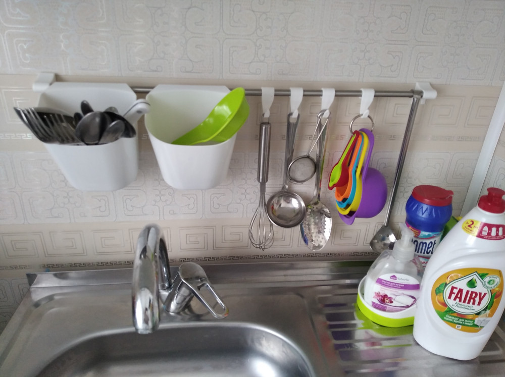 Очень хороший рейлинг, контейнера сняла и прикрепила пониже - удобнее брать вилки и ложки. Добавила полочку. Отлично смотрится.