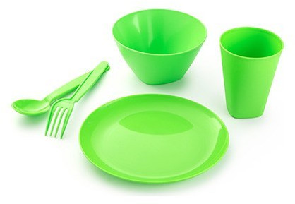 Хороший крепкий пластик. Посуда не пахнет. Цвет насыщенный. У вилки хлипкие зубцы, а ложка достаточно крепкая. В целом набор понравился.