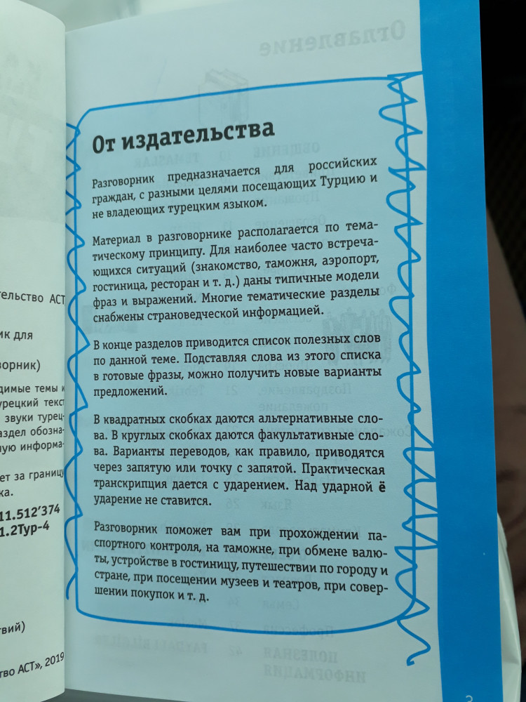 💳 Оплатить за товар можно при получении 🇰🇿 Есть бесплатная доставка по Казахстану от 1 дня 🎁 Копите бонусы с каждой покупки Серия: Лучший разговорник для путешествий Турецкий разговорник содержит самые необходимые темы и наиболее типичные модели фраз и выражений. Турецкий текст снабжен практической транскрипцией, передающей звуки турецкого языка средствами русской графики. Каждый раздел обозначен своим цветом — вы легко и быстро найдете нужную информацию. |