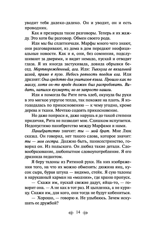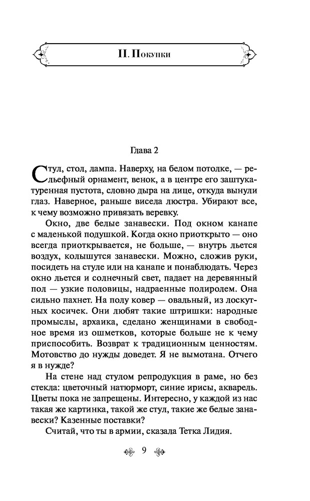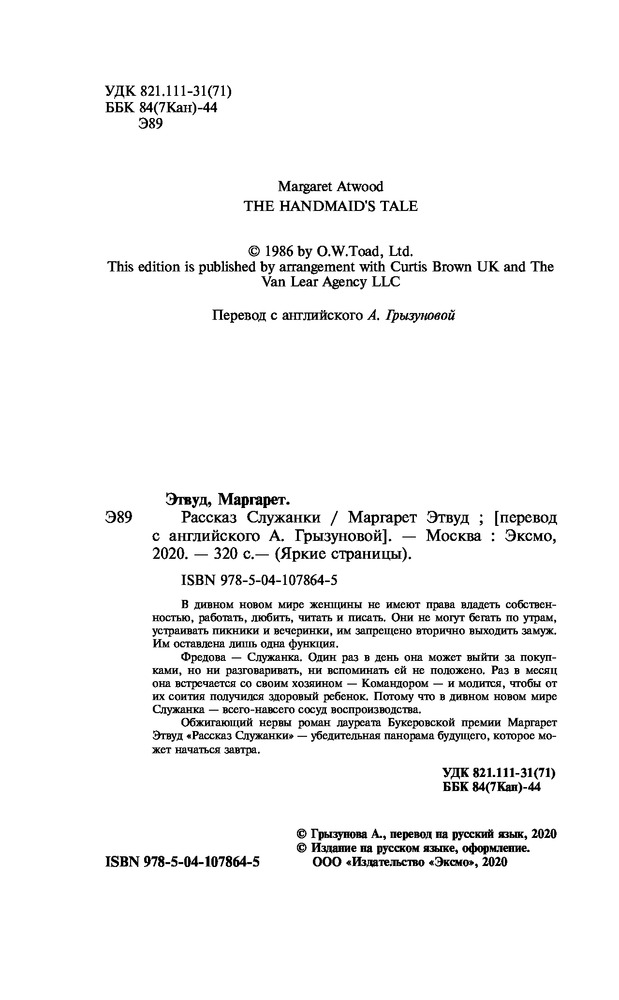 💳 Оплатить за товар можно при получении 🇰🇿 Есть бесплатная доставка по Казахстану от 1 дня 🎁 Копите бонусы с каждой покупки Серия: Яркие страницы В дивном новом мире женщины не имеют права владеть собственностью, работать, любить, читать и писать. Они не могут бегать по утрам, устраивать пикники и вечеринки, им запрещено вторично выходить замуж. Им оставлена лишь одна функция. Фредова — Служанка. Один раз в день она может выйти за покупками, но ни разговаривать, ни вспоминать ей не положено. Раз в месяц она встречается со своим хозяином — Командором — и молится, чтобы от их соития получился здоровый ребенок. Потому что в дивном новом мире Служанка — всего-навсего сосуд воспроизводства. Обжигающий нервы роман лауреата Букеровской премии Маргарет Этвуд «Рассказ Служанки» — убедительная панорама будущего, которое может начаться завтра. |