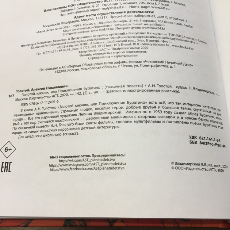 💳 Оплатить за товар можно при получении 🇰🇿 Есть бесплатная доставка по Казахстану от 1 дня 🎁 Копите бонусы с каждой покупки Серия: Детская иллюстрированная классика В книге А. Н. Толстого «Золотой ключик, или Приключения Буратино» есть всё, что так интересно читателю: увлекательные приключения, страшные злодеи, весёлые герои, добрые друзья и большая тайна, спрятанная на дне пруда... Всё это нарисовал художник Леонид Владимирский. Именно он в 1953 году создал образ Буратино, который с тех пор считается классическим — деревянный мальчишка с озорным взглядом и в красно-белом колпачке. По сказочной повести А. Н. Толстого были сняты фильмы, сделаны мультфильмы и поставлены пьесы. Буратино стал одним из самых известных персонажей детской литературы. Для младшего школьного возраста. |