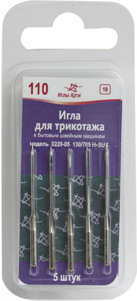 Универсальные иглы для швейных машин «Иглы Арти» изготовлены из металла высокого качества. Используются при пошиве трикотажа и многослойных материалов. Иглы имеют сферическую среднюю форму острия. Форма острия 05 соответствует международной классификации SUK.