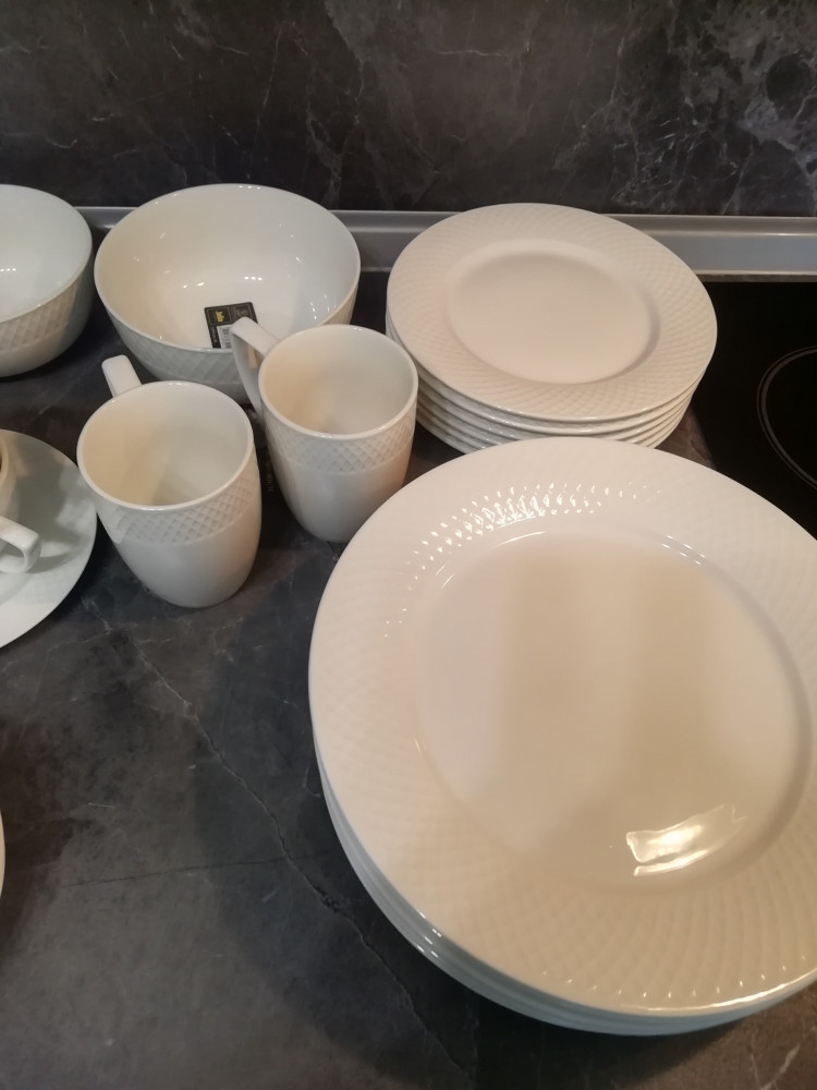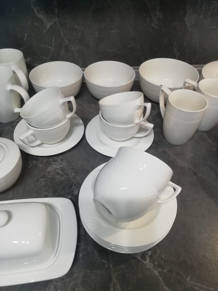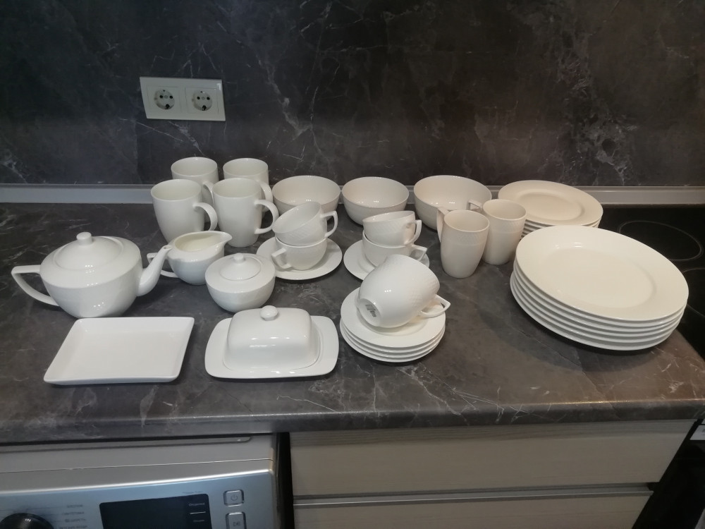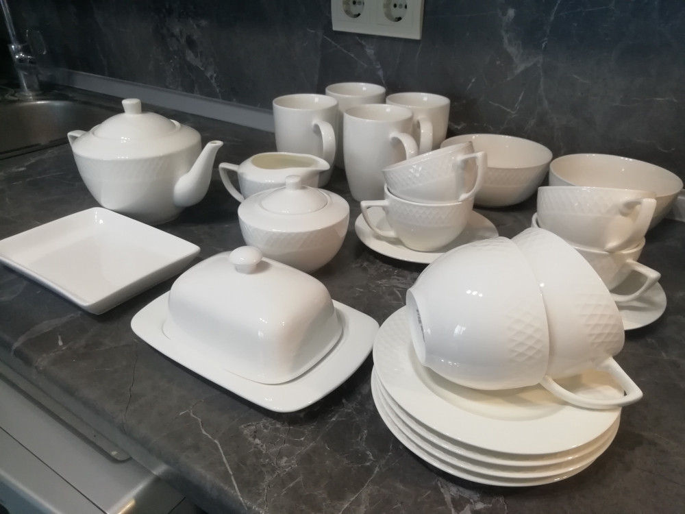 Купила весь сервиз 6 обеденных тарелок, 6 суповых, 6 десертных, чайный сервиз 6 пар, 2 салатника 14 см, 1 салатник 16 см, 2 кружки 350 мл, чайник, сахарница, молочник. Всё это серии Юлия Высоцкой. Ещё добавила серию fine 4 кружки 460 мл, 4 пирожковых тарелки 15 см, 3 чашки для мюсли и масленку. Получилось очень красиво.