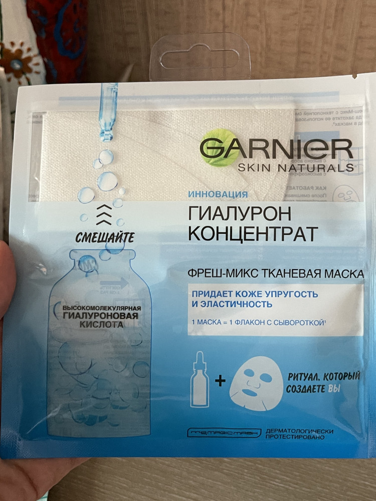 Гарниер Тканевая Маска Гиалурон Концентрат Интересная новинка с интересной упаковкой. Хорошо увлажняет кожу. Идеально подойдёт для сухой и смешанной кожи . Когда наносишь, ощущается как вторая кожа. Питает и придает сияние. Один минус оставляет немного липкость.