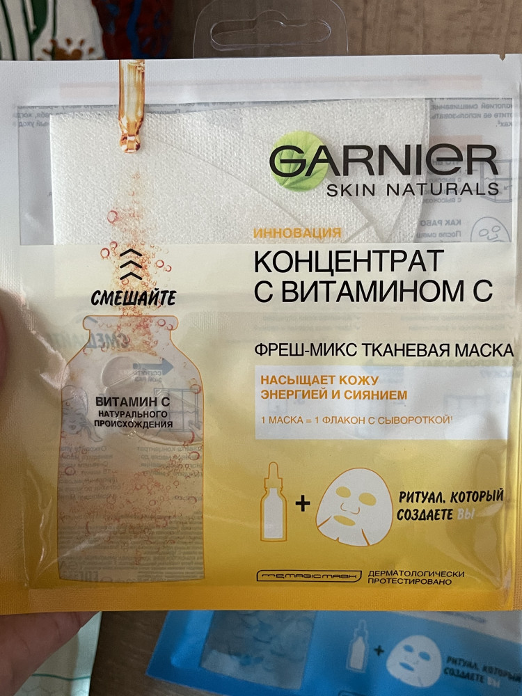 Гарниер Тканевая Маска Концентрат с витамином С Необычная упаковка. Маска поделена на 2 части - сыворотка и тканевая маска. Комфортное нанесение. Кожа выглядит ухоженной и отлично увлажнённой.