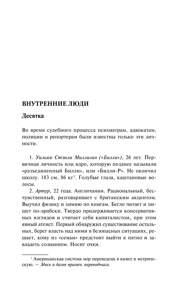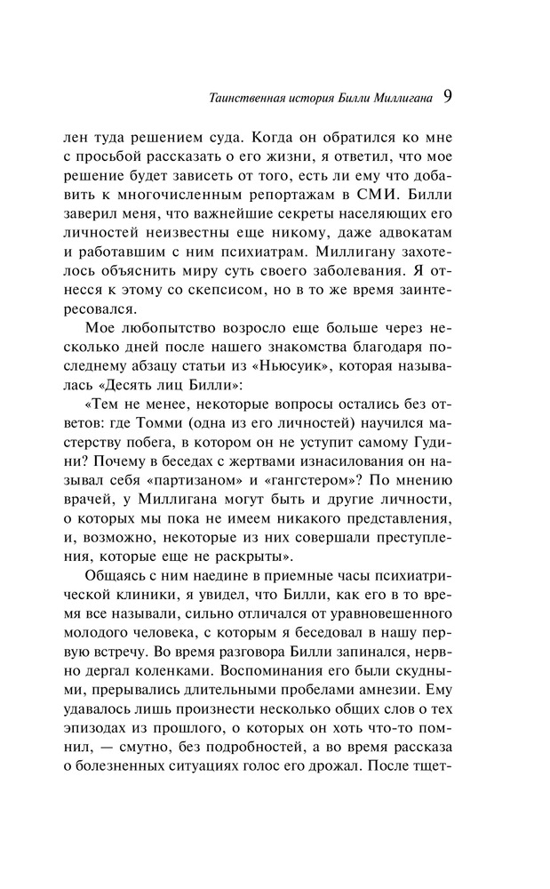 Как только начинаешь читать, книга сразу затягивает. Это невероятно, читаешь и не веришь. А ведь это было на самом деле. Жалко Билли, у него была действительно тяжелая жизнь. Было интересно читать о расщеплении личности. А когда на видео посмотрела как меняется его лицо, просто жуть:) Советую прочитать эту потрясающую книгу, оно того стоит!