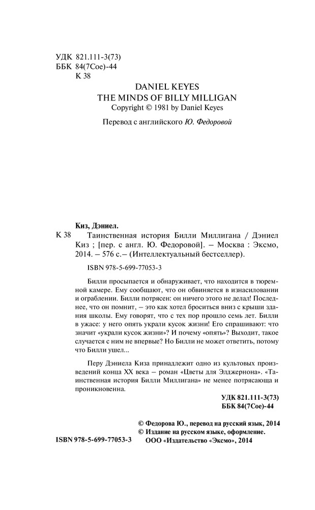 Таинственная история Билли МиллиганаВ данный момент этот товар отсутствует в продаже. Возможно, у нас найдется аналогичный или похожий товар здесь. Билли просыпается и обнаруживает, что находится в тюремной камере. Ему сообщают, что он обвиняется в изнасиловании и ограблении. Билли потрясен: он ничего этого не делал! Последнее, что он помнит, — это как хотел броситься вниз с крыши здания школы. Ему говорят, что с тех пор прошло семь лет. Билли в ужасе: у него опять украли кусок жизни! Его спрашивают: что значит "украли кусок жизни"? И почему "опять"? Выходит, такое случается с ним не впервые? Но Билли не может ответить, потому что Билли ушел… Перу Дэниела Киза принадлежит одно из культовых произведений конца XX века — роман "Цветы для Элджернона". "Таинственная история Билли Миллигана" не менее потрясающа и проникновенна. |
