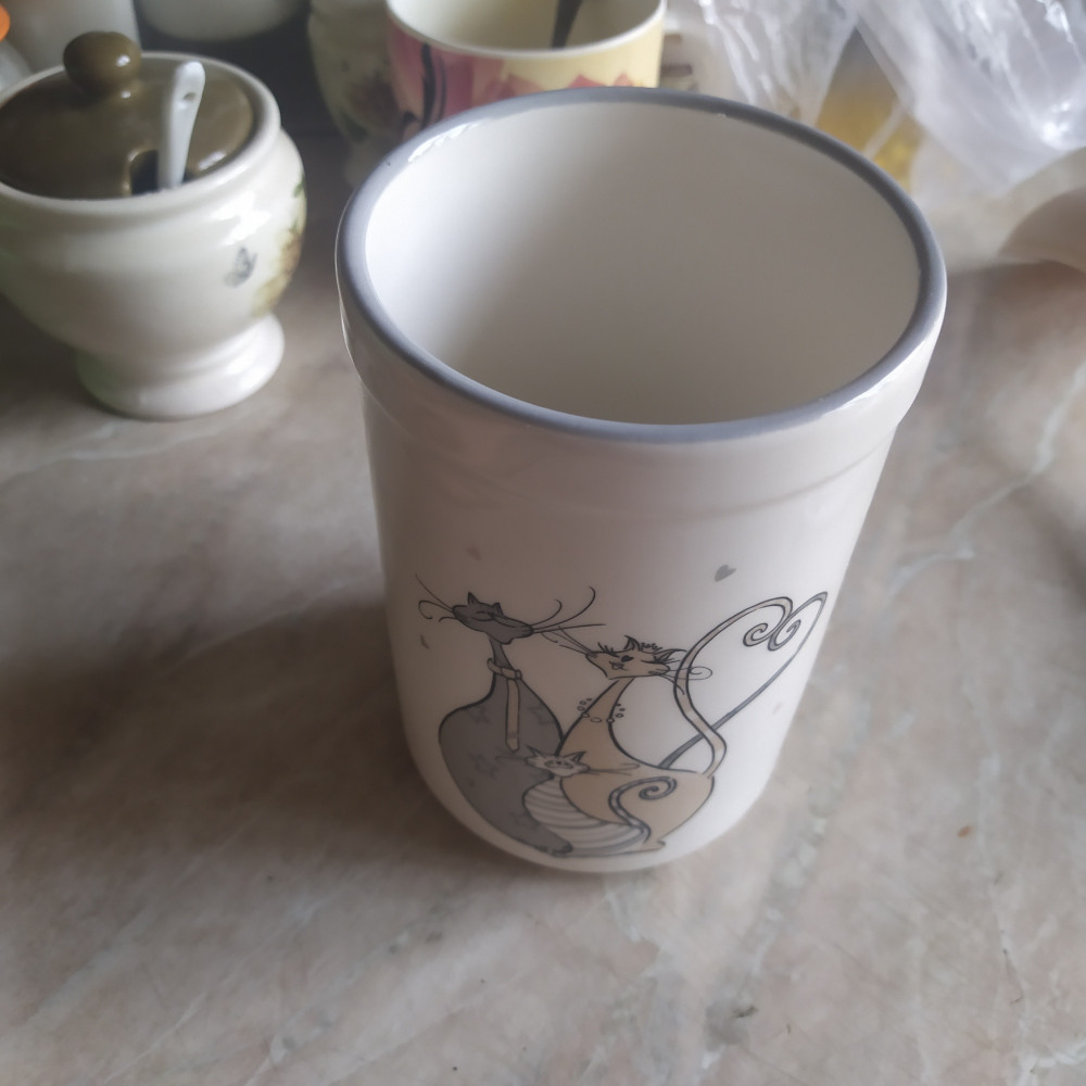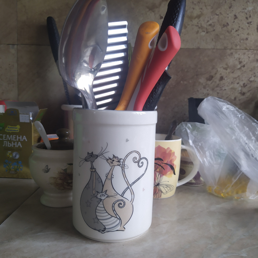 Как подставку для ложек-вилок жалко эту вещь использовать, т.к. они железные и могут сделать скол. Лучше использовать как подставку для прорезиненных лопаток и другого инвентаря, который предназначен для антипригарной посуды, т.к. такие вещи лёгкие и прорезиненные, не повредят глазированное покрытие подставки. А ещё эту подставку можно использовать как вазу для цветов.