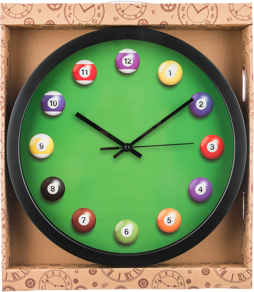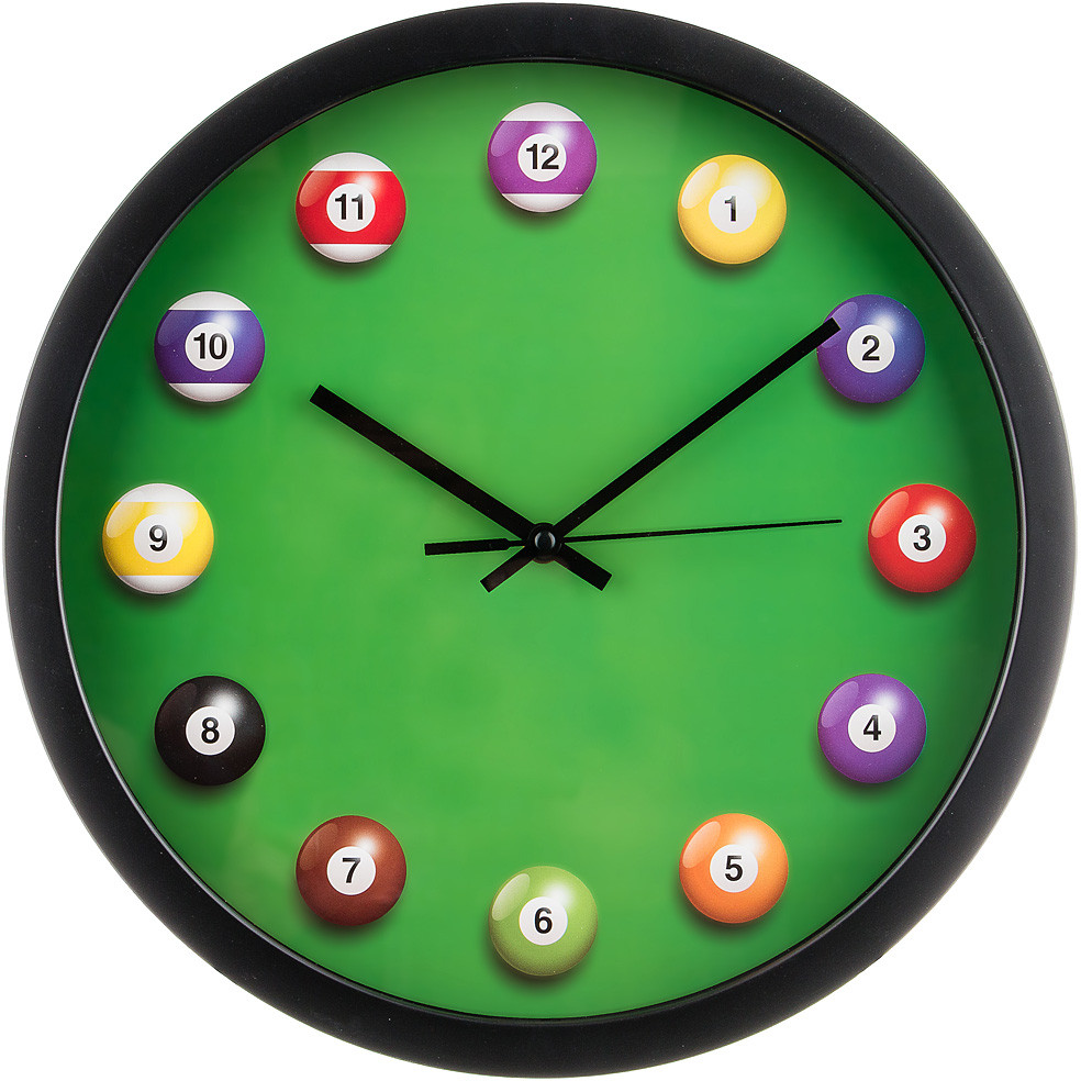 Крупные, яркие, время видно издалека, за счёт чёрных стрелок и «бильярдных шариков», на которые написаны цифры.