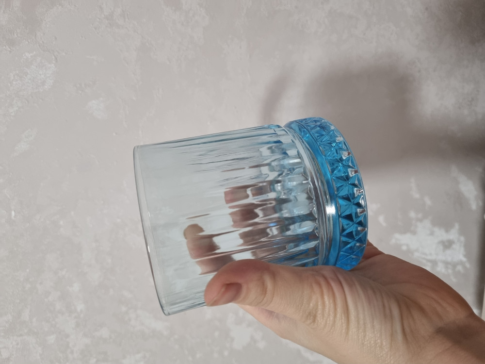 Стеклянные стаканы, цвет - дымчато-синий. Очень большие, очень тяжёлые. Думаю теперь, для какого они напитка предназначены. Смотрится стильно.
