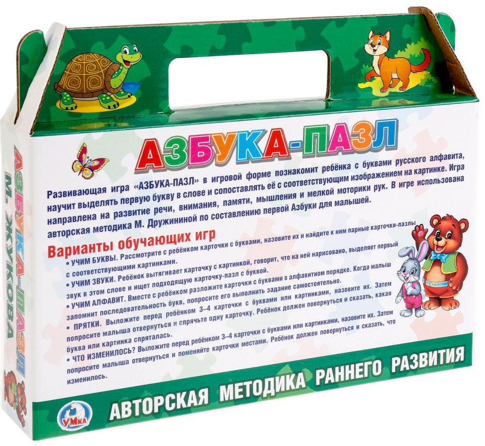 💳 Оплатить за товар можно при получении 🇰🇿 Есть бесплатная доставка по Казахстану от 1 дня 🎁 Копите бонусы с каждой покупки Азбука-пазл М. Жукова — уникальное пособие ТМ «Умка» для обучения детей. Он изготовлен из плотного картона, покрытого яркими, чёткими иллюстрациями букв русского алфавита и изображениями предметов и животных названия, которых начинаются на эти буквы с подписями. Весь сборный алфавит защищает от вытирания специальная плёнка. Прорези пазла идеально подходят друг к другу, края их закруглены. Пазл развивает усидчивость, внимание, память, ориентацию в пространстве, мелкую моторику рук, ассоциативное мышление, знакомит с алфавитом, готовит к чтению. |