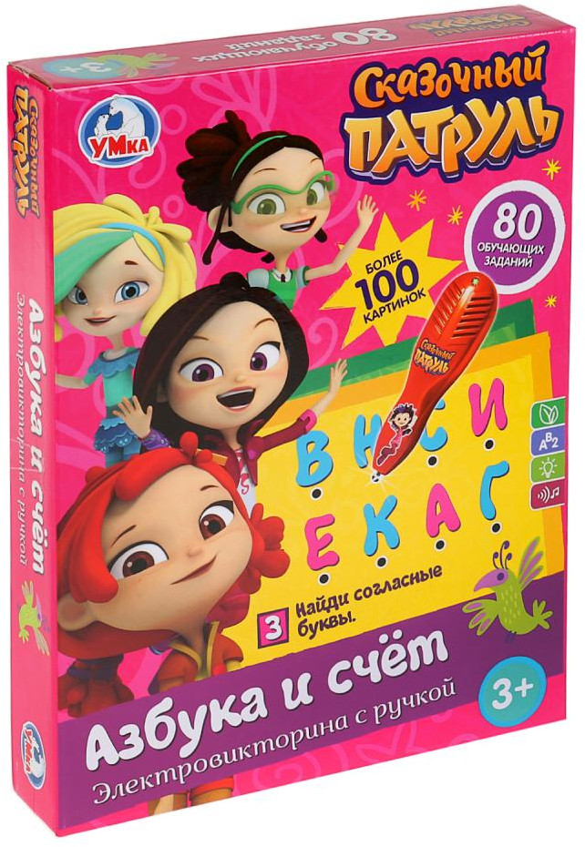 💳 Оплатить за товар можно при получении 🇰🇿 Есть бесплатная доставка по Казахстану от 1 дня 🎁 Копите бонусы с каждой покупки Электровикторина с ручкой «Сказочный патруль. Азбука и счёт» — новинка ТМ «Умка» — это целая домашняя школа для маленьких любознаек! |