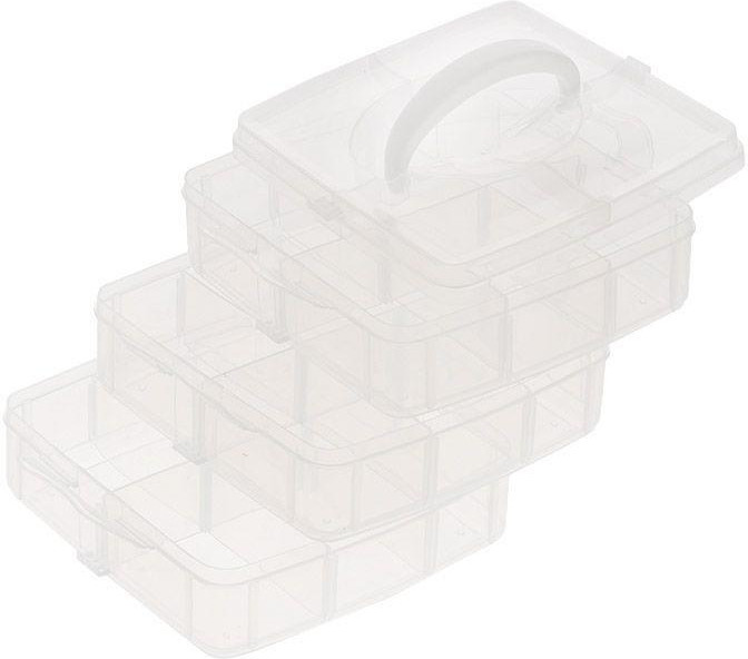 Контейнер для мелочей «Hobby & Pro» изготовлен из прозрачного пластика, что позволяет видать содержимое. Подходит для хранения швейных принадлежностей, рыболовных снастей, мелких деталей и других бытовых мелочей. Контейнер содержит три яруса, любой из которых имеет 6 прямоугольных секций. Ярусы плотно закрываются на защелки, что позволяет хранить очень мелкие предметы.