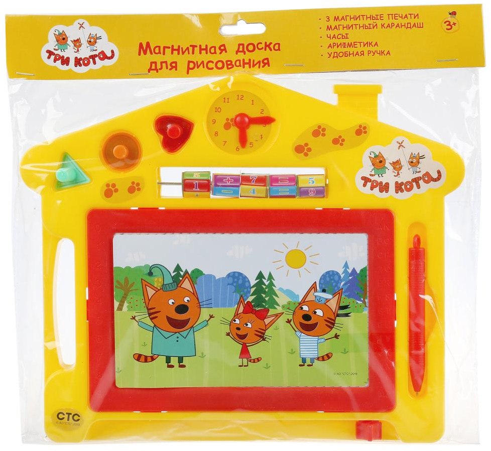 На красочной магнитной доске с изображениями любимых персонажей детей из мультфильма «Три кота» рисовать ещё интереснее. Специальный магнитный карандаш в комплекте не поцарапает поверхность и не испачкает руки. Если закончилось место, просто сотрите нарисованное специальным рычагом снизу. Доска снова чистая и можно продолжать творить. Над окошком для рисования располагаются яркие арифметические счёты с простыми арифметическими примерами, которые можно комбинировать. С помощью этой доски ребёнок будет не только развивать свои творческие способности, но и учиться считать и определять время. Удобная ручка сбоку позволяют брать досочку собой, чтобы развлечь ребенка во время поездки. Игра с магнитной доской развивает фантазию и воображение, творческое мышление, мелкую моторику.