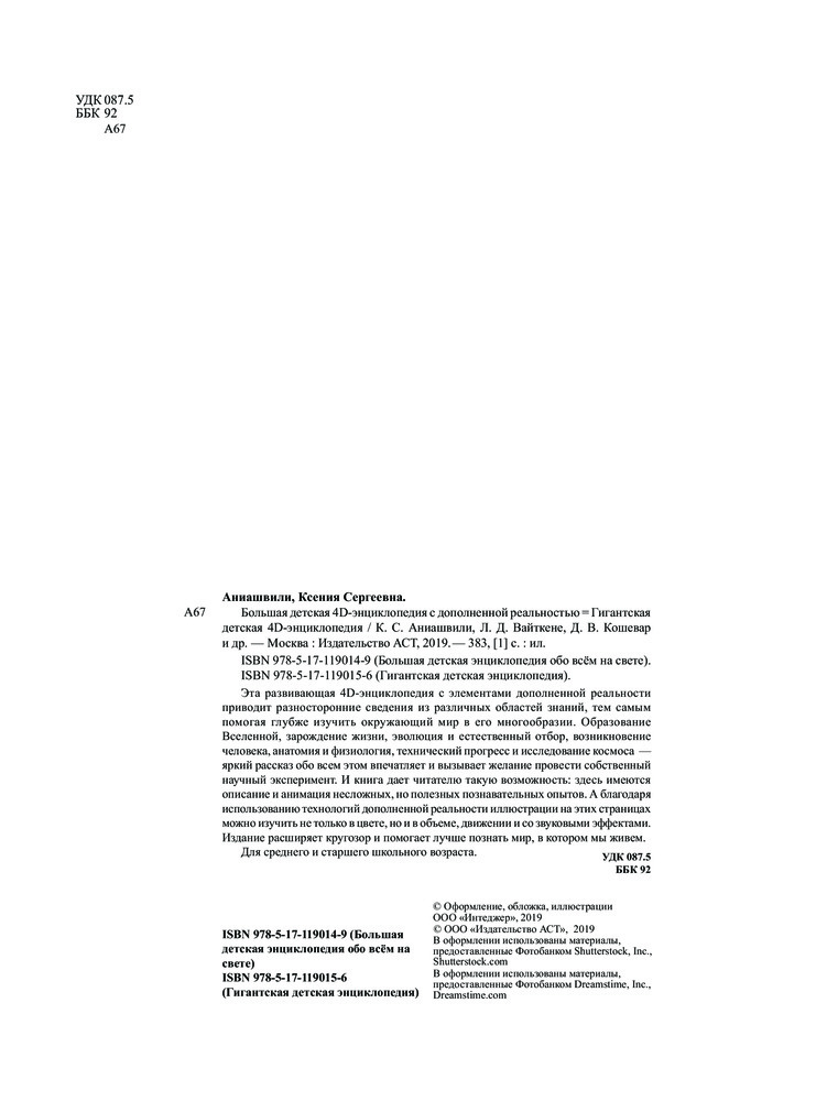 💳 Оплатить за товар можно при получении 🇰🇿 Есть бесплатная доставка по Казахстану от 1 дня 🎁 Копите бонусы с каждой покупки Серия: Гигантская детская энциклопедия Эта развивающая 4D-энциклопедия с элементами дополненной реальности приводит разносторонние сведения из различных областей знаний, тем самым помогая глубже изучить окружающий мир в его многообразии. Образование Вселенной, зарождение жизни, эволюция и естественный отбор, возникновение человека, анатомия и физиология, технический прогресс и исследование космоса — яркий рассказ обо всем этом впечатляет и вызывает желание провести собственный научный эксперимент. И книга дает читателю такую возможность: здесь имеются описание и анимация несложных, но полезных познавательных опытов. А благодаря использованию технологий дополненной реальности иллюстрации на этих страницах можно изучить не только в цвете, но и в объеме, движении и со звуковыми эффектами. Издание расширяет кругозор и помогает лучше познать мир, в котором мы живем. Для среднего и старшего школьного возраста. |