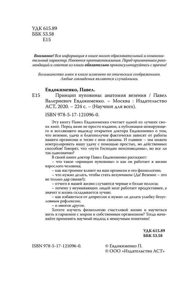 💳 Оплатить за товар можно при получении 🇰🇿 Есть бесплатная доставка по Казахстану от 1 дня 🎁 Копите бонусы с каждой покупки Серия: Научпоп для всех Доктор Павел Евдокименко — практикующий врач-ревматолог, невролог, академик российской Академии Медико-Технических Наук (АМТН РФ), один из ведущих специалистов по лечению болезней позвоночника и суставов. Ведет YouTube-канал «Разумная медицина доктора Евдокименко» — канал о здоровье для разумных людей. |
