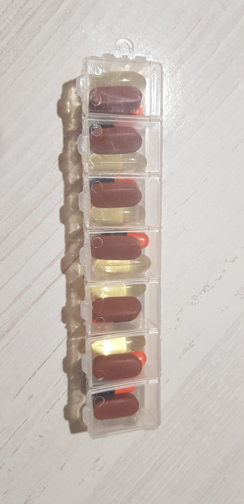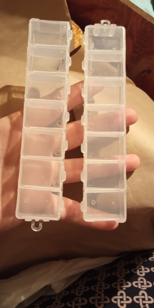 Брала как две небольших таблетницы. Меньше аптечных. Если таблетки небольшие и их немного на день, то как раз удобно, чтобы много места не занимало. Для больших капсул типа омеги по 1 г уже не пойдет, влезут только две штуки в одно отделение, а в день таких нужно минимум 4. На фото положила в отделения крупные и средние капсулы. Наверное, удобно для бисера или бусинок. Крышечки плотные, но без направляющих сбоку, нужно следить, чтобы не закрыть криво, иначе может остаться щель сбоку (несложно).