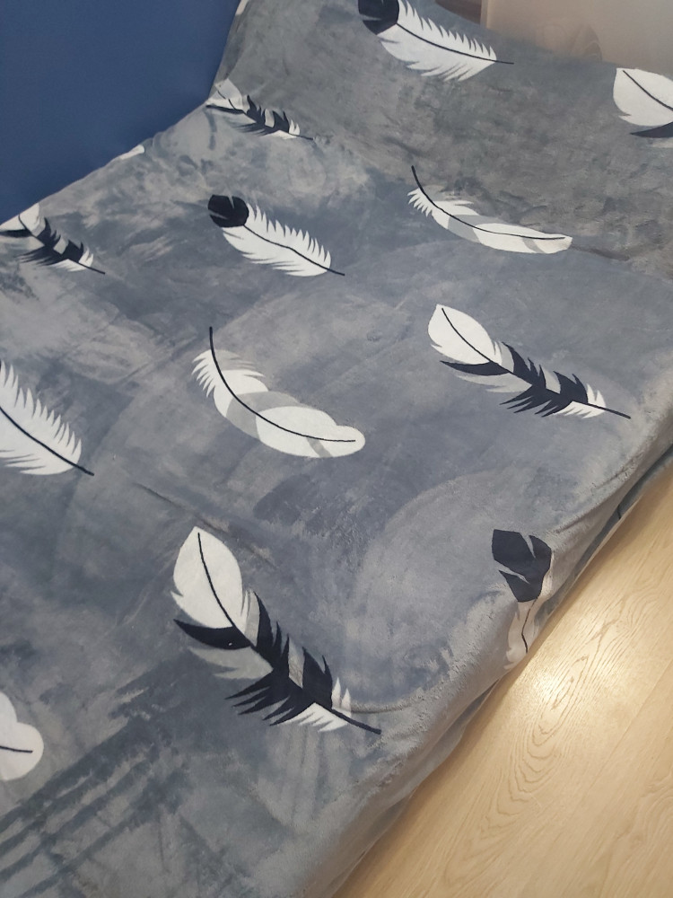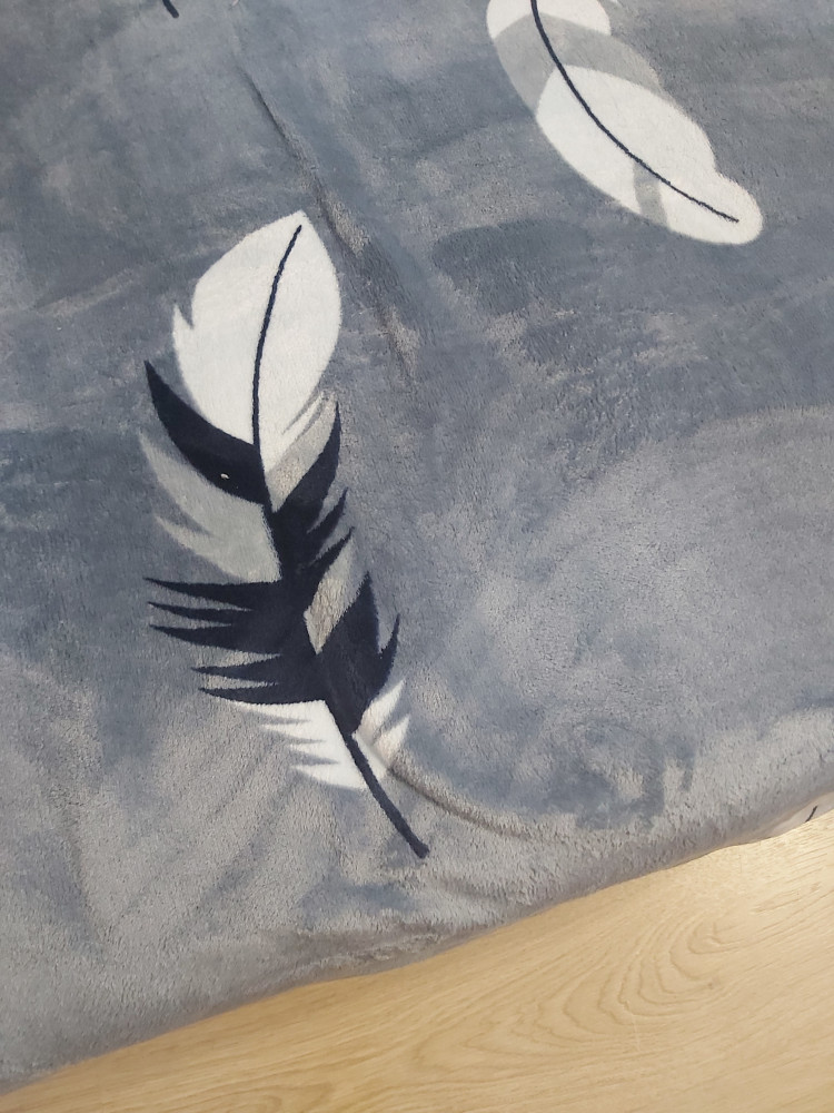 Плед мягкий, средней плотности. Есть но: 1) он стелиться перышками поперёк кровати, а не вдоль, как показано на фото 2) цвет фото сиренево-голубой, а перья темно- синие. Мне подошёл, но возможно это для Вас будет критично при заказе.