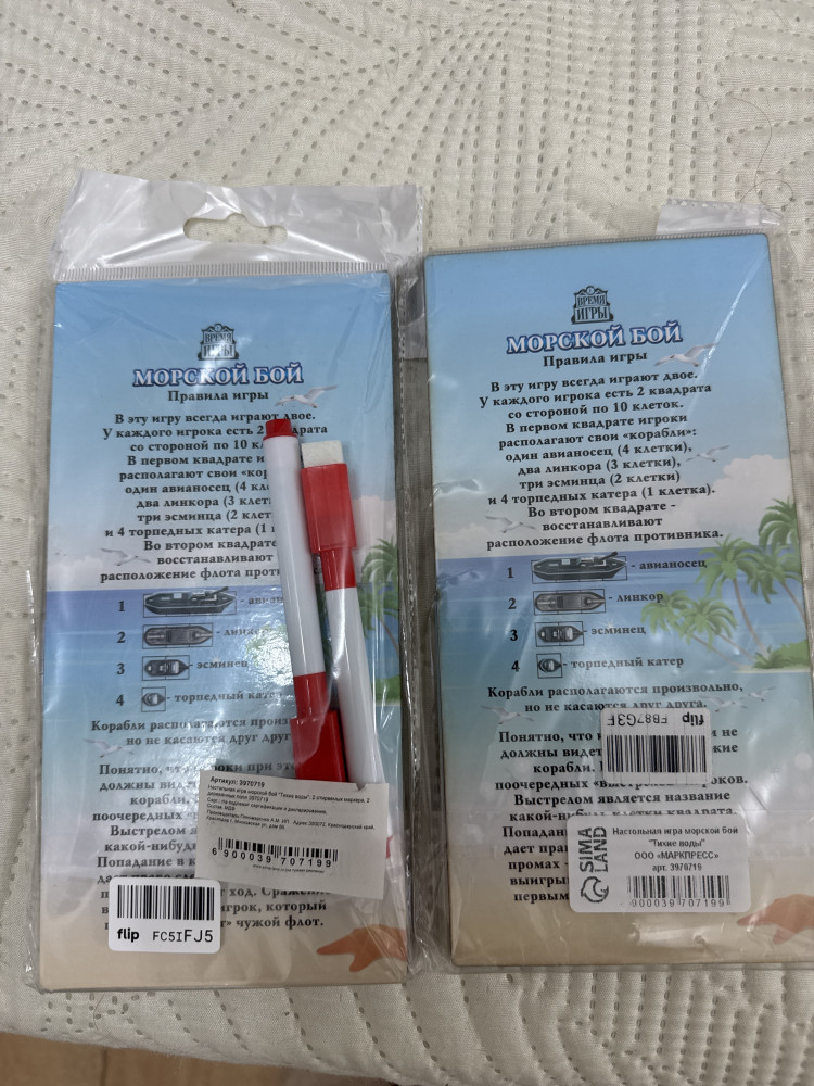 Игра настольная "Морской бой" отличного качества! В одной упаковке находятся два очень прочных деревянных планшета, поскольку игра рассчитана на двух игроков. Два маркера (не высохших!), разного цвета. На противоположной стороне маркера находится резинка для стирания. Т.е. играть можно много раз. Условия игры и количество разных кораблей описаны на обратной стороне планшеток. Просто безупречно выполнена игра!