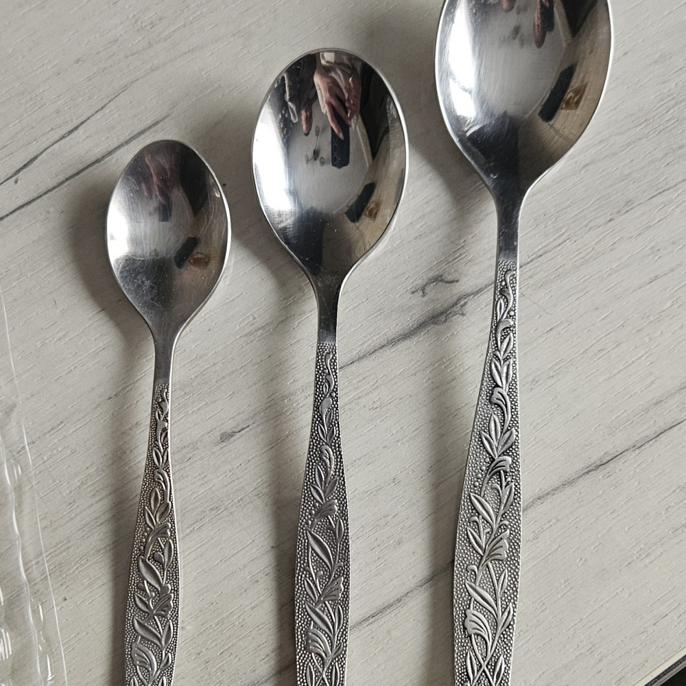 Отличная серия Уралочка. У меня теперь весь набор. Десертные ложечки больше, чем чайные, но меньше столовых. Фото смотрите. Качество стали хорошее, не тонкие. Рисунок четкий с двух сторон. Похоже на советское качество.