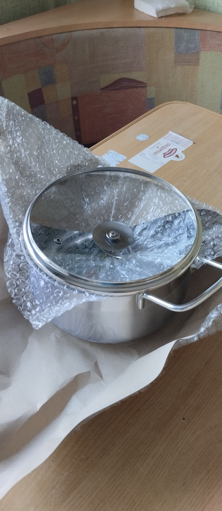 Флип спасибо за доставку, как всегда 👍 Кастрюля немного меньше, чем я ожидала. Без фирменной упаковки. Просто в коричневой оберточной бумаге. Спасибо Флип, что завернули в пупырку крышку. На последнем фото видно, как была упакована. . На мой взгляд дороговато, её стоимость тысяч 7-8. Понравилось, что ручки приделаны снаружи, т е. нет заклёпок внутри кастрюли. Кастрюля тонкая, лёгкая. Хотела подарить, но без коробки никак, потому оставлю себе. В общем претензий к кастрюльке нет, но вот не "ВАУ!", словно чего-то не хватает, потому 4⭐