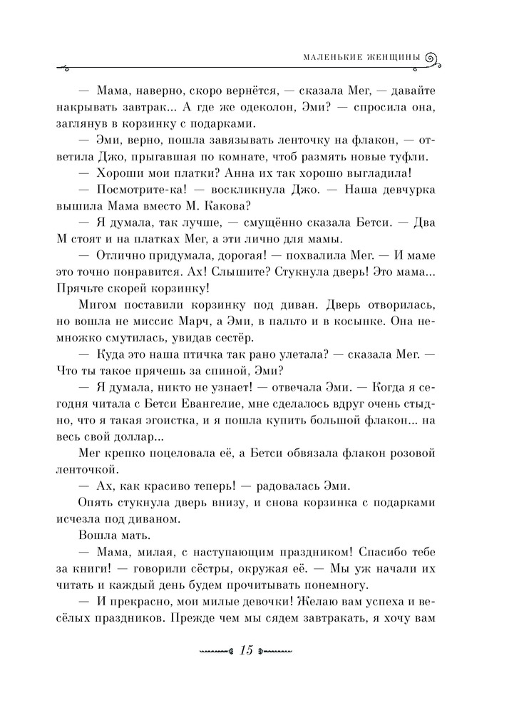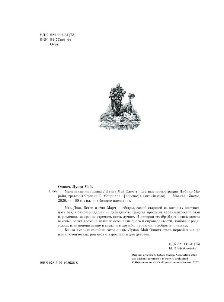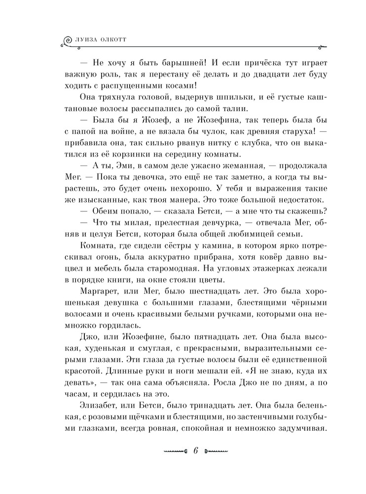 Маленькие женщиныВ данный момент этот товар отсутствует в продаже. Возможно, у нас найдется аналогичный или похожий товар здесь. Серия: Золотое наследие Мег, Джо, Бетси и Эми Марч — сёстры, самой старшей из которых шестнадцать лет, а самой младшей — двенадцать. Каждая проходит через непростой этап взросления, искренне стремясь стать лучше. В истории сестёр Марч описываются важные во все времена истины: осознание долга и справедливости, любовь к родителям, взаимопонимание в семье и в дружбе, проявление доброты к людям. |