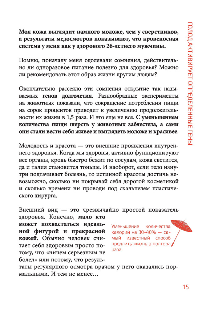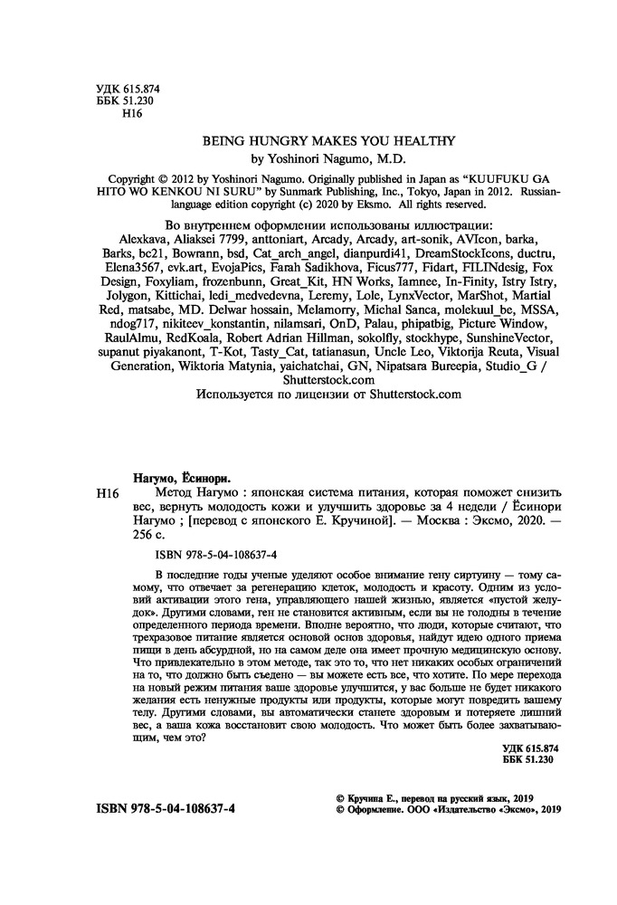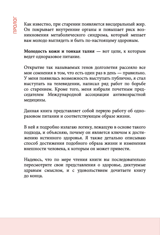 Метод Нагумо. Японская система питания, которая поможет снизить вес, вернуть молодость кожи и улучшить здоровье за 4 неделиВ данный момент этот товар отсутствует в продаже. Возможно, у нас найдется аналогичный или похожий товар здесь. Серия: Body and mind. Книги, которые меняют тебя и твое тело (обложка) В последние годы ученые уделяют особое внимание гену сиртуину — тому самому, что отвечает за регенерацию клеток, молодость и красоту. Одним из условий активации этого гена, управляющего нашей жизнью, является «пустой желудок». Другими словами, ген не становится активным, если вы не голодны в течение определенного периода времени. Вполне вероятно, что люди, которые считают, что трехразовое питание является основой основ здоровья, найдут идею одного приема пищи в день абсурдной, но на самом деле она имеет прочную медицинскую основу. Что привлекательно в этом методе, так это то, что нет никаких особых ограничений на то, что должно быть съедено — вы можете есть все, что хотите. По мере перехода на новый режим питания ваше здоровье улучшится, у вас больше не будет никакого желания есть ненужные продукты или продукты, которые могут повредить вашему телу. Другими словами, вы автоматически станете здоровым и потеряете лишний вес, а ваша кожа восстановит свою молодость. Что может быть более захватывающим, чем это? |
