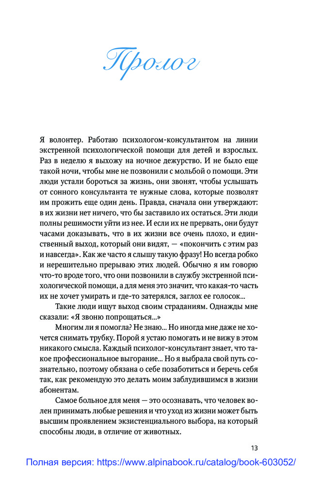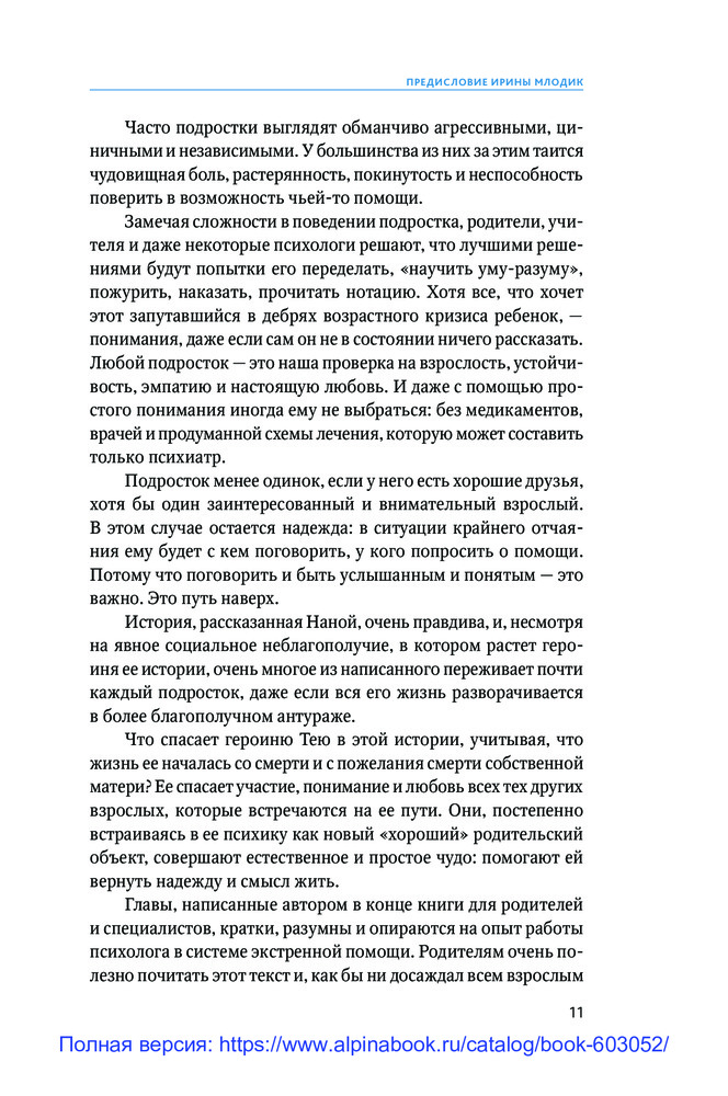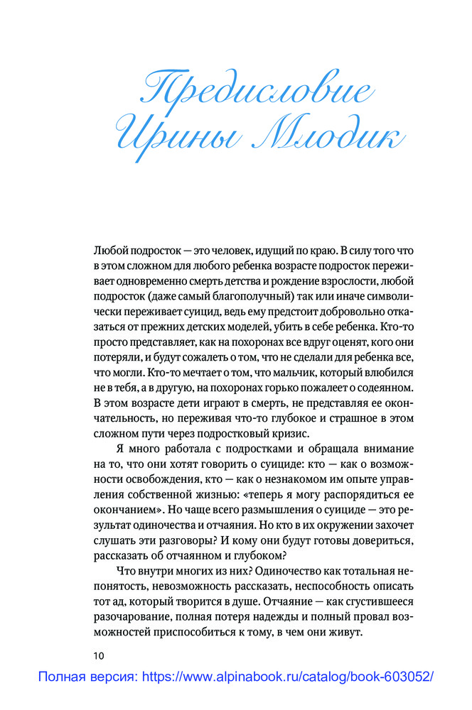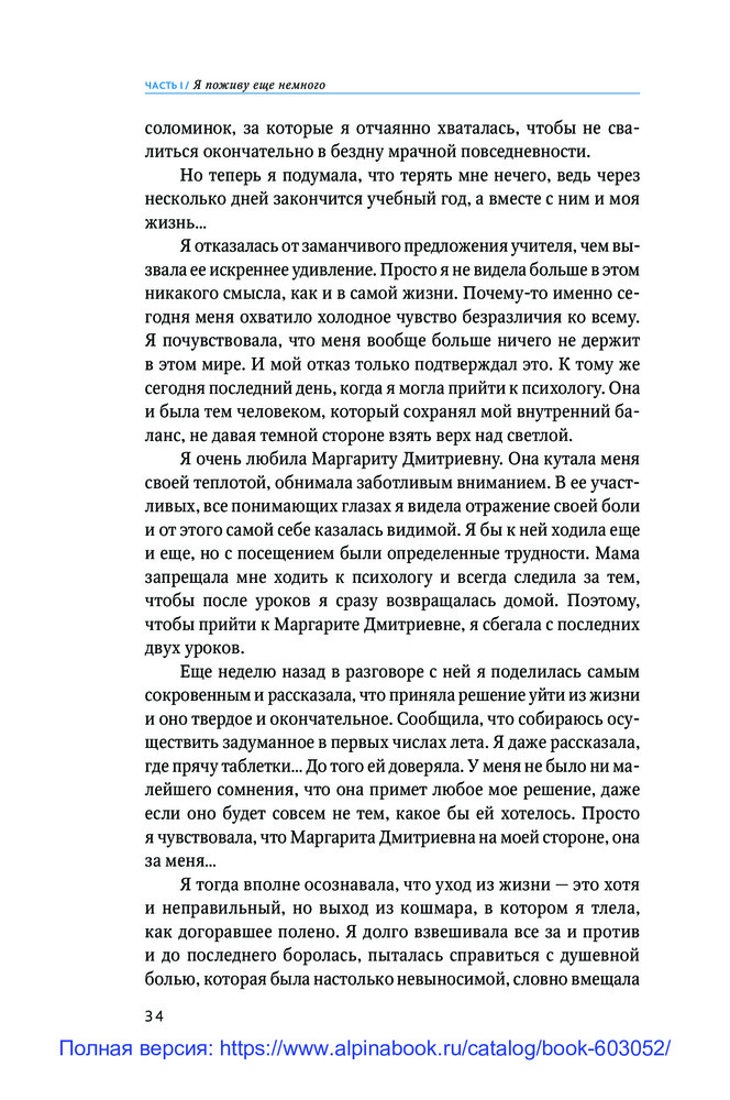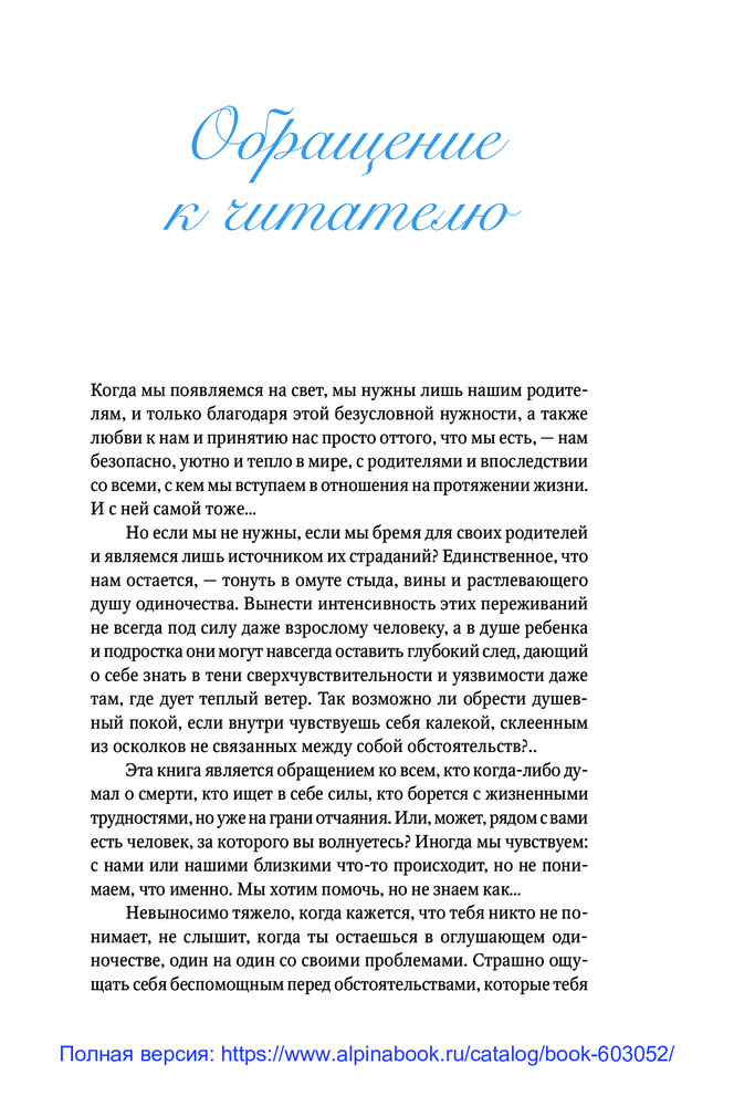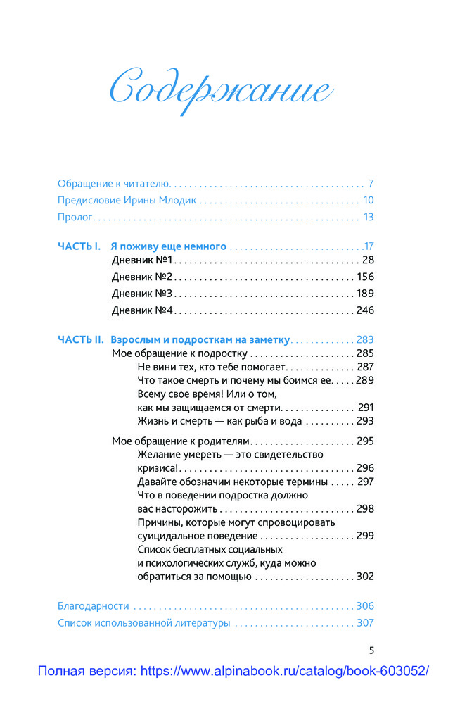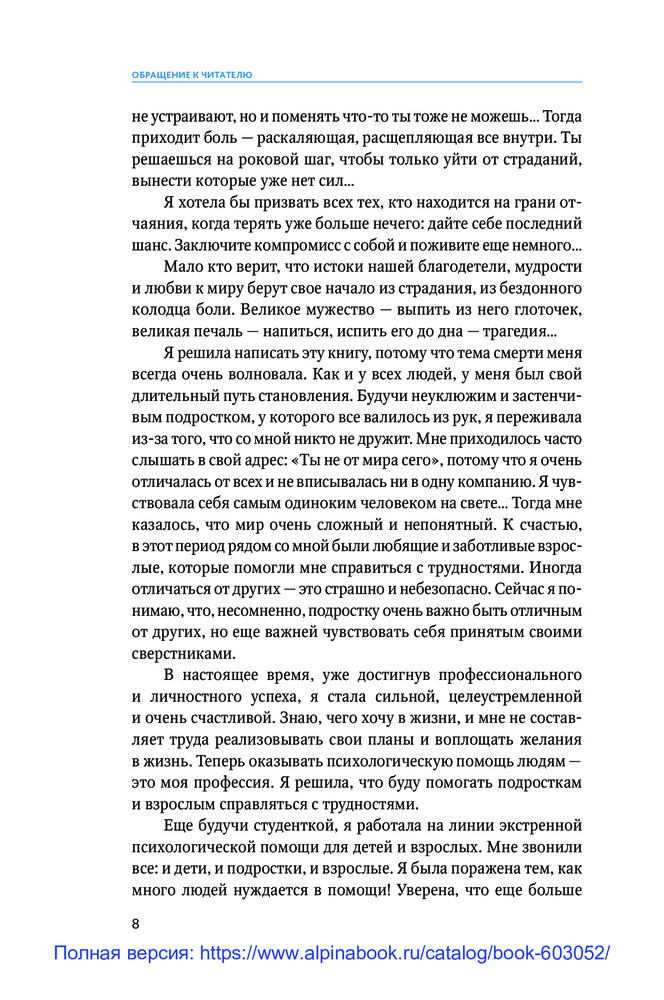Я поживу еще немного. Дневник подросткаВ данный момент этот товар отсутствует в продаже. Возможно, у нас найдется аналогичный или похожий товар здесь. В жизни бывают ситуации, когда кажется, что все пропало, ничего не получается и ты никому не нужен. Чувство непонимания, горя, отчаянья и всепоглощающая боль застилают дневной свет и подталкивают к краю. В такие тяжелые моменты человеку, особенно подростку, необходима поддержка. Но как оказать ее правильно? Как помочь так, чтобы не навредить? А что делать, если вся эта боль — внутри вас и вы сами отчаянно ищете выход? Ответы вы найдете в этой книге вместе с рекомендациями психолога и полезными контактами, которые в критическую минуту могут спасти вас или вашего близкого. |