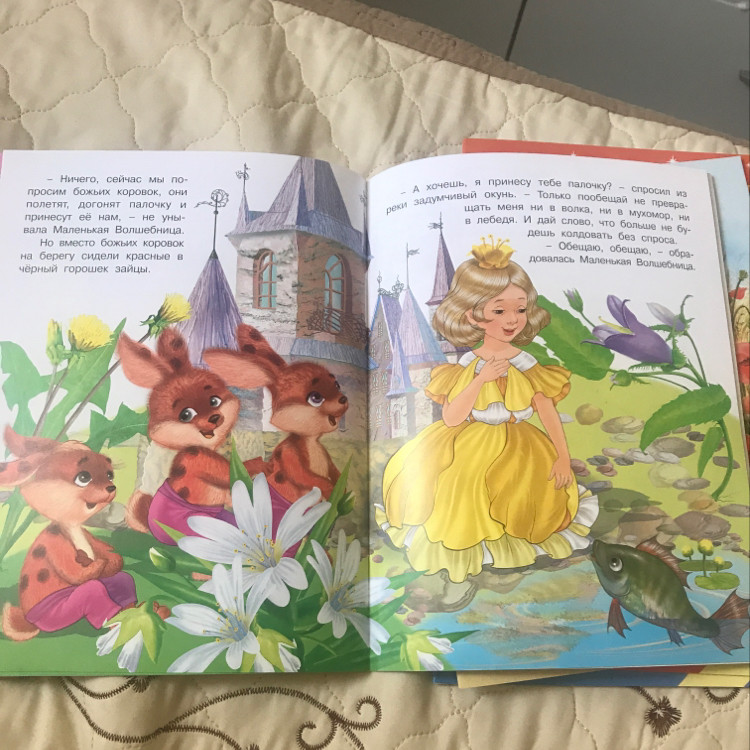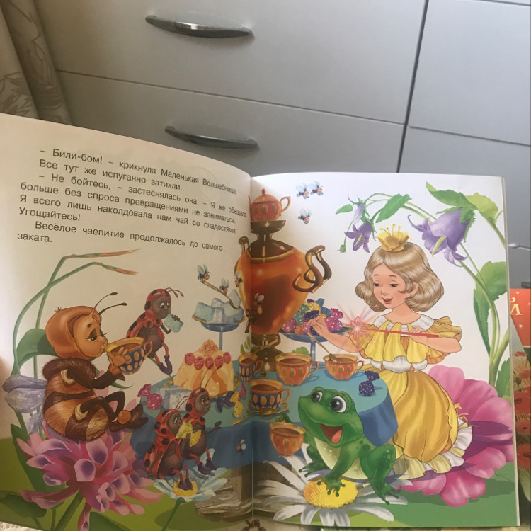 Отлично изданная книжка! Переплёт, хотя и не картонный, но прочный. Страницы книжки белые, глянцевые. Очень красивые, красочные и большие иллюстрации. Сказка о том, как Маленькая Волшебница без разрешения осуществляла превращения: Шмеля - в Принца, но Принц получился толстый и полосатый, он возмутился этому!). Итак, все превращения без разрешения превращаемых, кроме их возмущения, радости не принесли. Маленькая Волшебница пообещала больше не превращать никого без их разрешения, И все превращённые снова стали сами собой. Полезная для воспитания детей сказка - будь самим собой!!! Замечательная, красивая и полезная сказка.