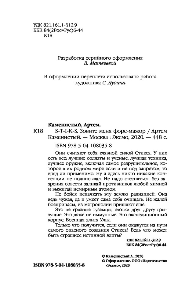 S-T-I-K-S. Зовите меня форс-мажорВ данный момент этот товар отсутствует в продаже. Возможно, у нас найдется аналогичный или похожий товар здесь. Серия: Новый фантастический боевик. Миры Артема Каменистого Они считают себя главной силой Стикса. У них есть все: лучшие солдаты и ученые, лучшая техника, лучшее оружие, включая самое разрушительное, которое в их родном мире если и не под запретом, то вряд ли применимо. Ну а здесь никто никакие конвенции не подписывал. Не надо стесняться, без зазрения совести заливай противников любой химией и выжигай немирным атомом. Не бойся испачкать эту землю радиацией. Она ведь чужая, да и умеет сама себя очищать. Не жалей боеприпасы, из метрополии пришлют еще. Это не грязные туземцы, глотки друг другу грызущие. Это даже не иммунные. Это экспедиционный корпус. Военная элита Улья. Только что получится, если они окажутся на пути самого опасного создания Стикса? Ведь что может быть страшнее истинной элиты? |