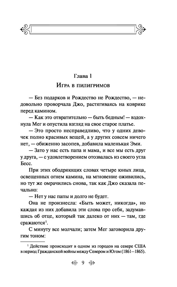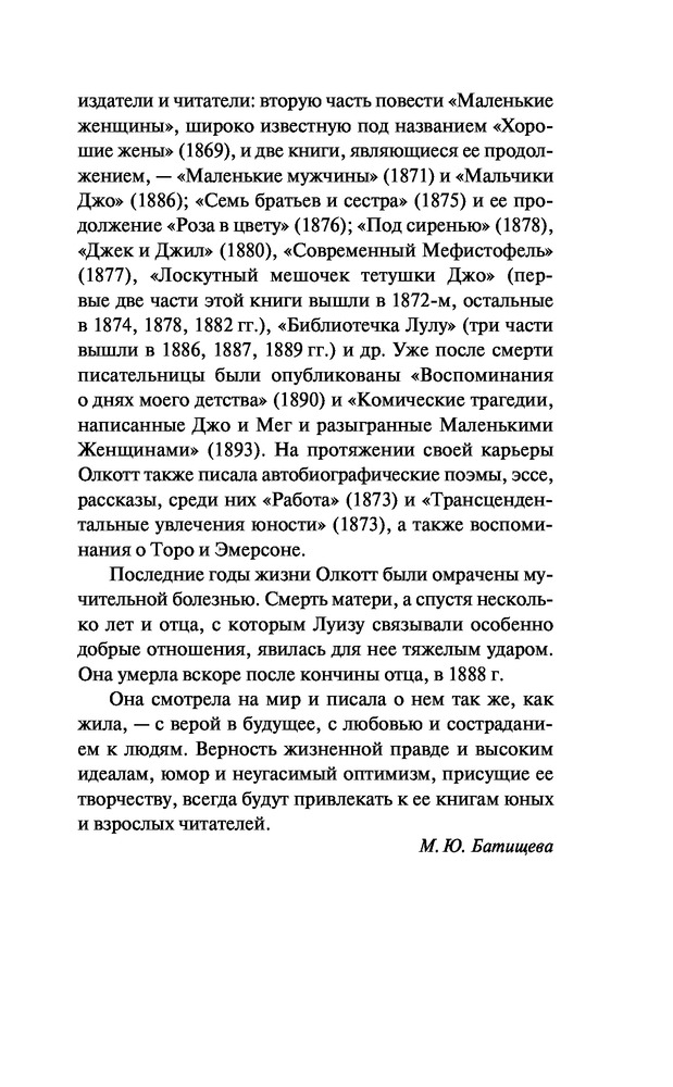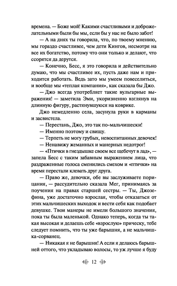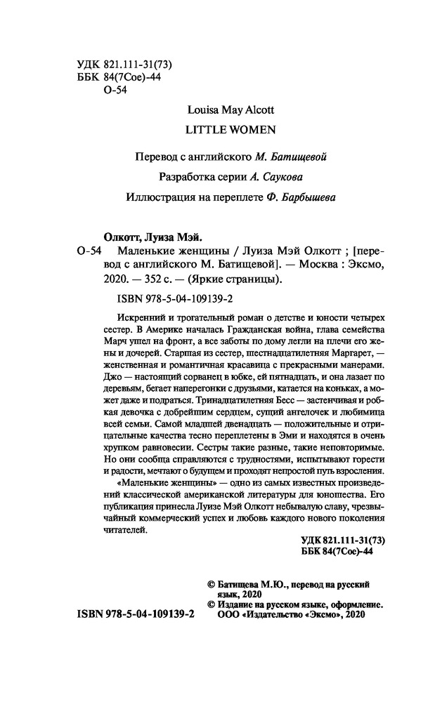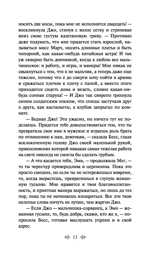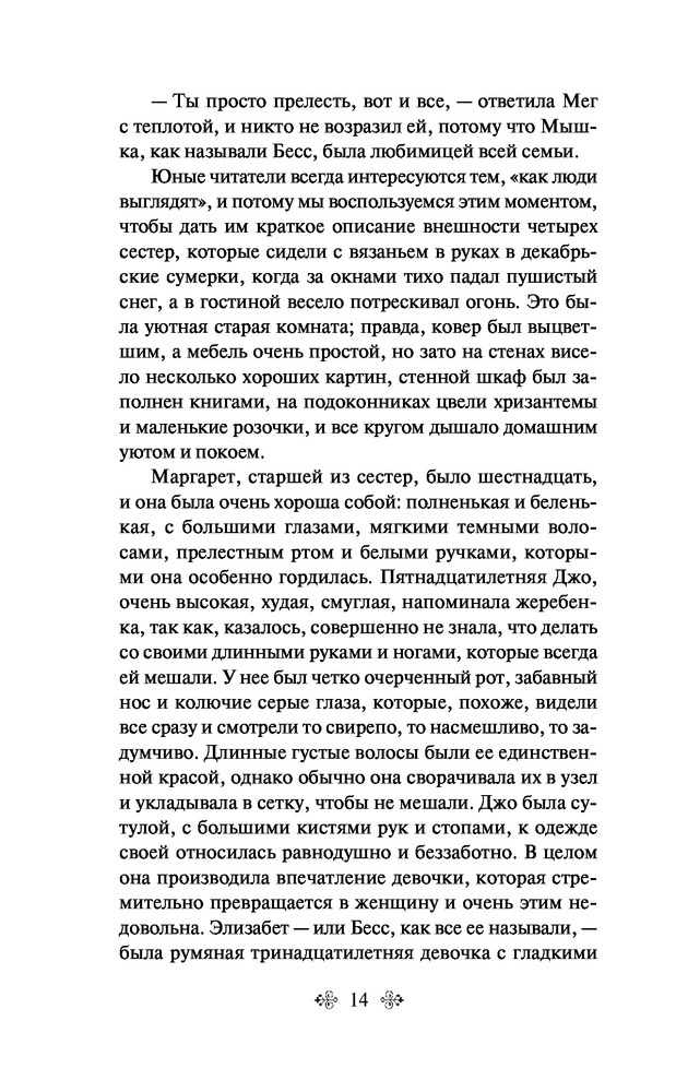 Маленькие женщиныВ данный момент этот товар отсутствует в продаже. Возможно, у нас найдется аналогичный или похожий товар здесь. Серия: Яркие страницы Искренний и трогательный роман о детстве и юности четырех сестер. В Америке началась Гражданская война, глава семейства Марч ушел на фронт, а все заботы по дому легли на плечи его жены и дочерей. Старшая из сестер, шестнадцатилетняя Маргарет — женственная и романтичная красавица с прекрасными манерами. Джо — настоящий сорванец в юбке, ей пятнадцать и она лазает по деревьям, бегает наперегонки с друзьями, катается на коньках, а может даже и подраться. Тринадцатилетняя Бесс — застенчивая и робкая девочка с добрейшим сердцем, сущий ангелочек и любимица всей семьи. Самой младшей двенадцать — положительные и отрицательные качества тесно переплетены в Эми и находятся в очень хрупком равновесии. Сестры такие разные, такие неповторимые. Но они сообща справляются с трудностями, испытывают горести и радости, мечтают о будущем и проходят непростой путь взросления. |