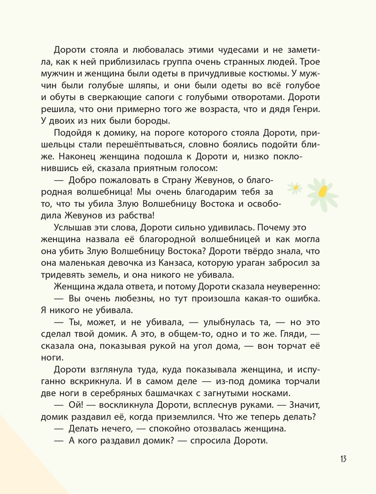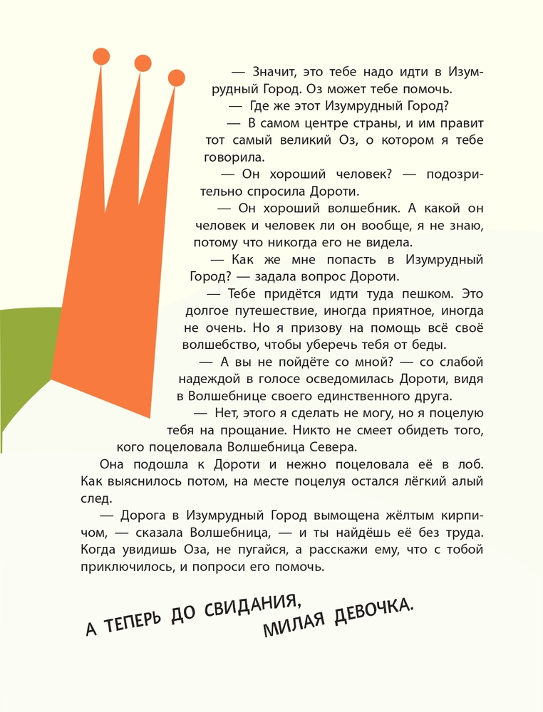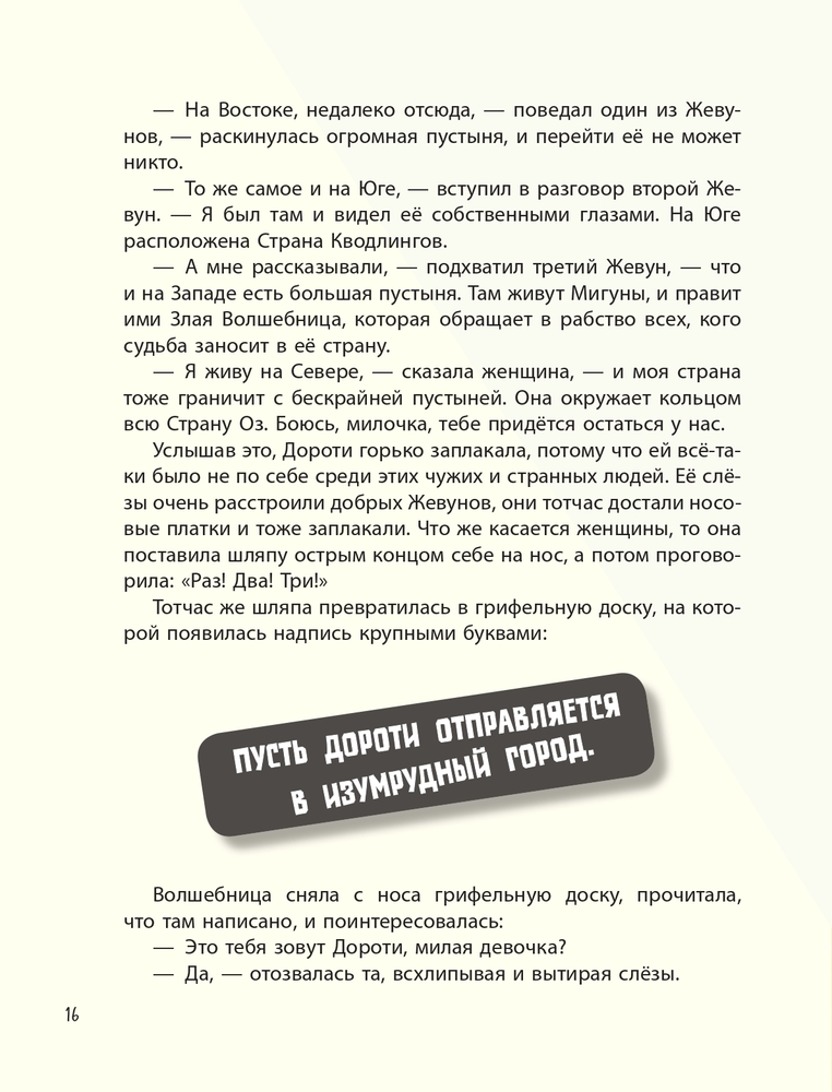 В данный момент этот товар отсутствует в продаже. Возможно, у нас найдется аналогичный или похожий товар здесь. Серия: Золотые сказки для детей Что увидела Дороти, когда ураган забросил её домик в волшебную страну? Диковинные, словно вырезанные из картона деревья, покрытые листвой самых разных оттенков. Уходящую за горизонт жёлтую ленту — дорогу из кирпича. Дома, то похожие на большой чайный сервиз, то возвышающиеся небоскрёбами над стенами Изумрудного города... «А не похожа ли волшебная страна Оз на театр?», — подумали художники La Studio и рассказали известную сказку американца Л.Ф. Баума по-своему. Переворачиваются страницы, и герои разыгрывают перед читателями целое представление: Дороти путешествует по волшебной стране, находит друзей, побеждает врагов... И наконец, выдержав все испытания, она щёлкнет каблучками серебряных туфелек — и вернётся домой. |