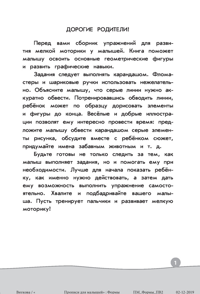 💳 Оплатить за товар можно при получении 🇰🇿 Есть бесплатная доставка по Казахстану от 1 дня 🎁 Копите бонусы с каждой покупки Серия: Прописи. Развиваем навыки (обложка) Главная задача пособия — развить мелкую моторику, подготовить руку ребёнка к письму и помочь ему запомнить основные геометрические фигуры в процессе весёлой увлекательной игры. Сначала дошкольнику предлагается аккуратно обвести линии, после чего он сможет самостоятельно дорисовать элементы фигур по образцу. Выполняя занимательные задания, ребёнок научится уверенно владеть карандашом, сможет развить внимание и воображение, станет более усидчивым и аккуратным. А забавные картинки будут стимулировать интерес к обучению. Адресовано любознательным дошкольникам, их родителям, воспитателям ДОУ и может быть использовано как для индивидуальных, так и для групповых занятий. |